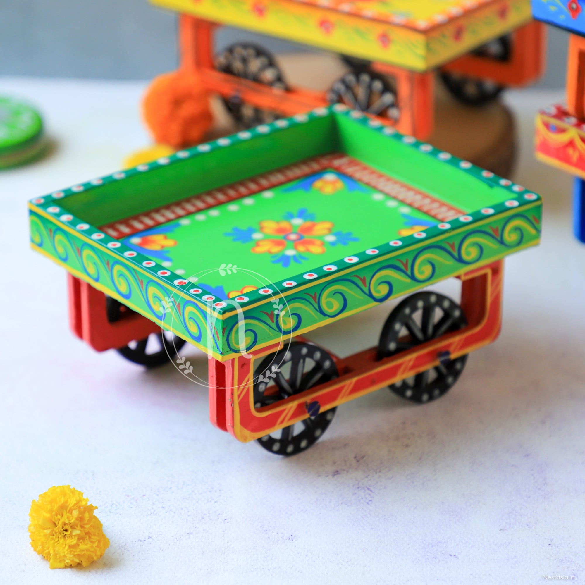 Wooden cart or Thela that looks traditional and can also move around with the help of the wheels. The authentic looking wooden cart comes in yellow, blue, green and red colours with traditional hand paint and designs. Serve up snack or sweets in bowls or serve glasses or small plates for the festive season or use the carts as decor ornaments. One can also match the trays with the wooden kettles and serve tea on them or use them as decor for kitty party decoration, Mehendi decor or any other celebration that involves traditional decor.
