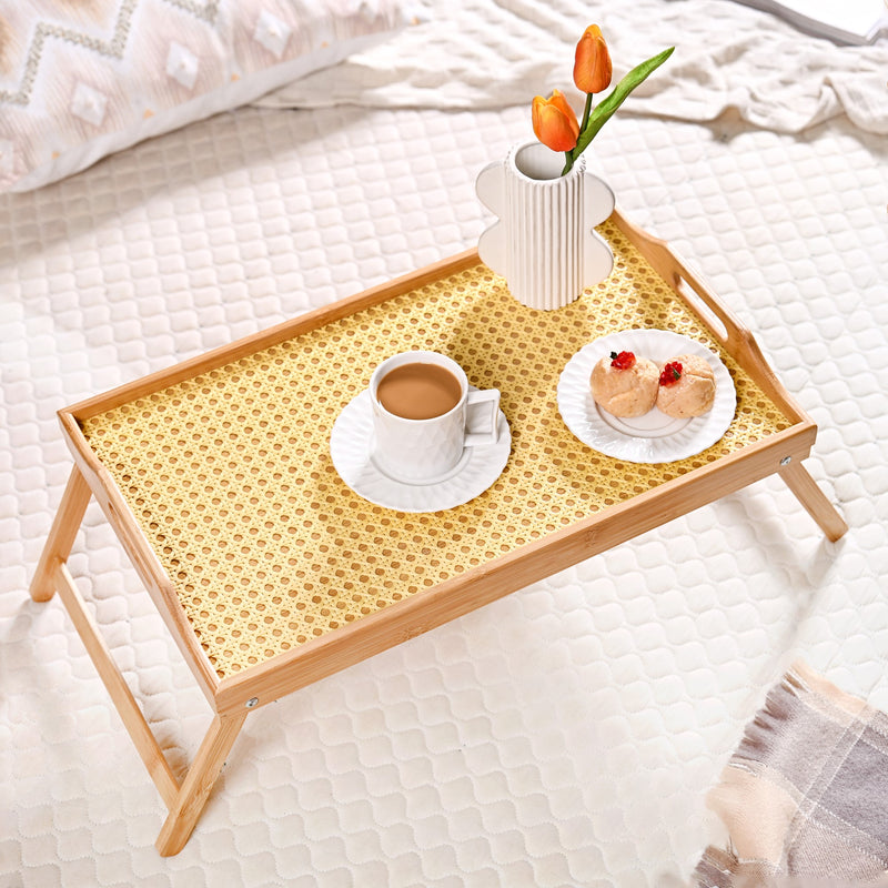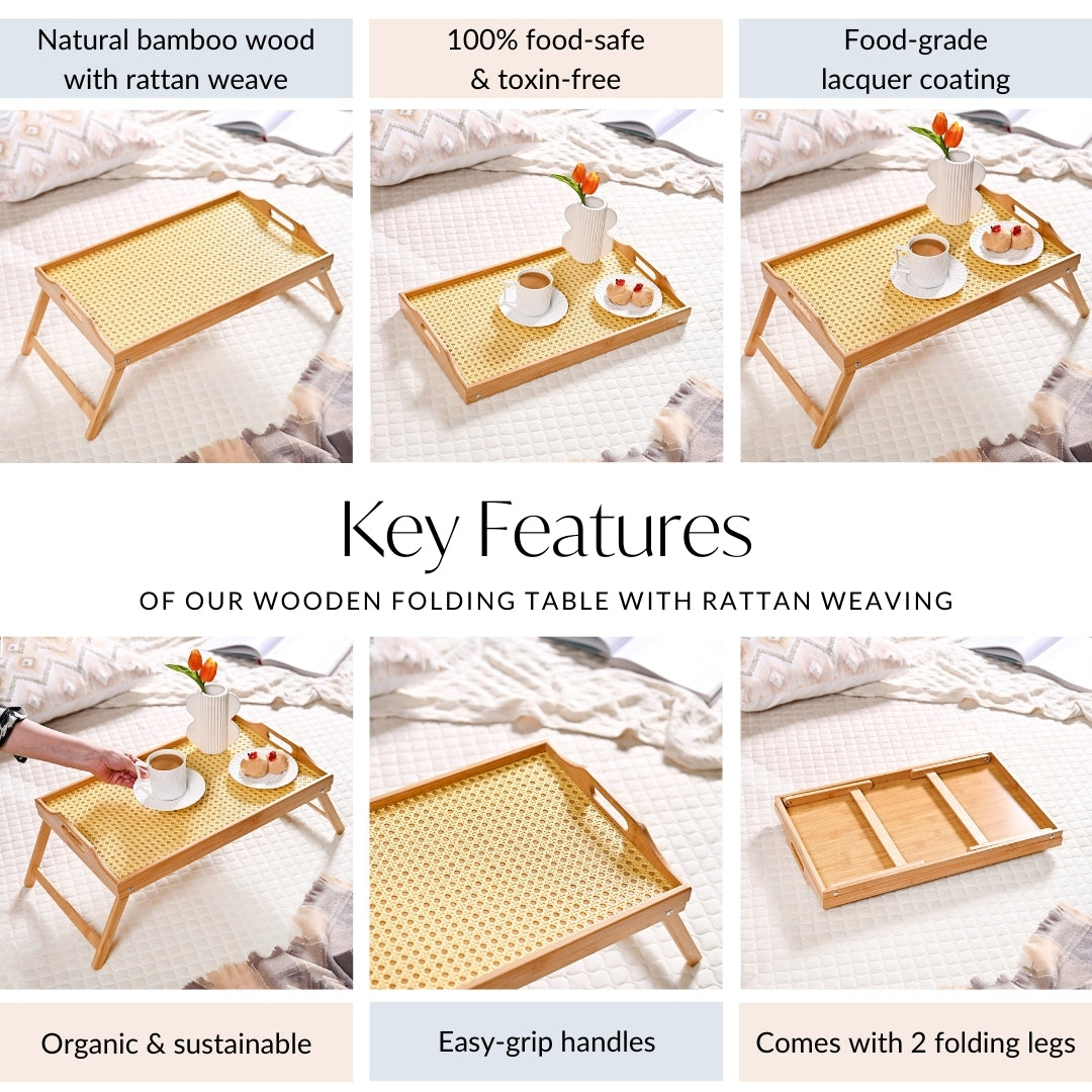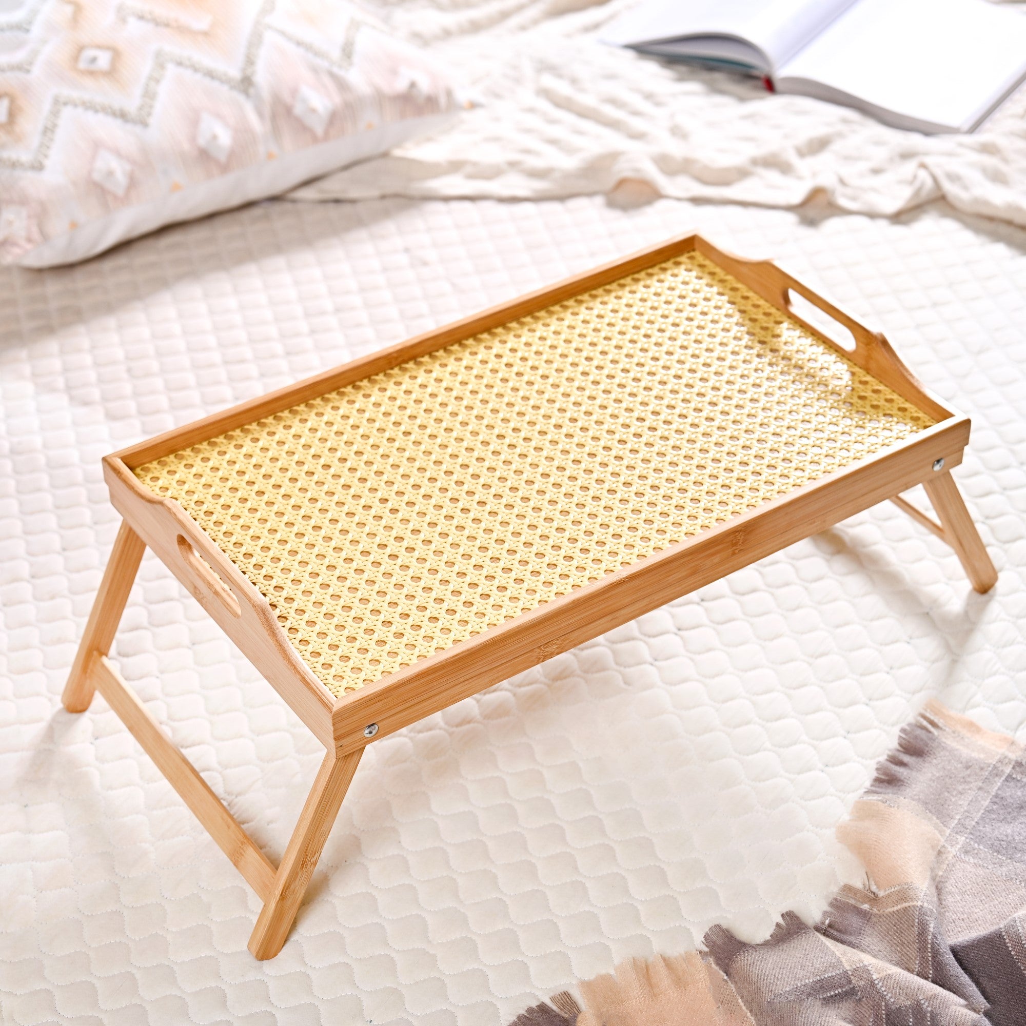 Design: The bed table features a chic rattan weave that adds a touch of elegance to any bedroom aesthetic. With easy-grip handles for convenient carrying, the two folding legs of the breakfast table allow for simple storage and portability.