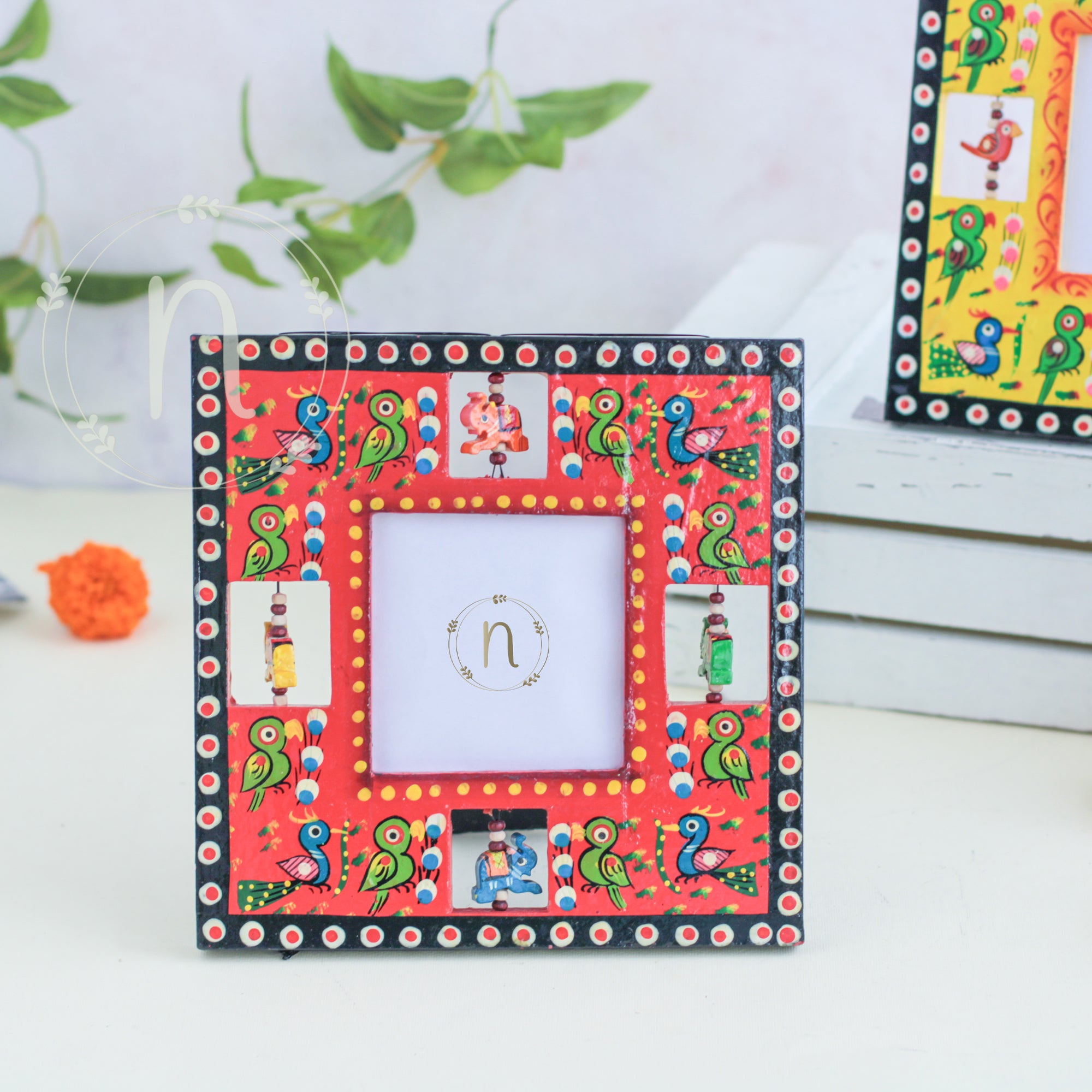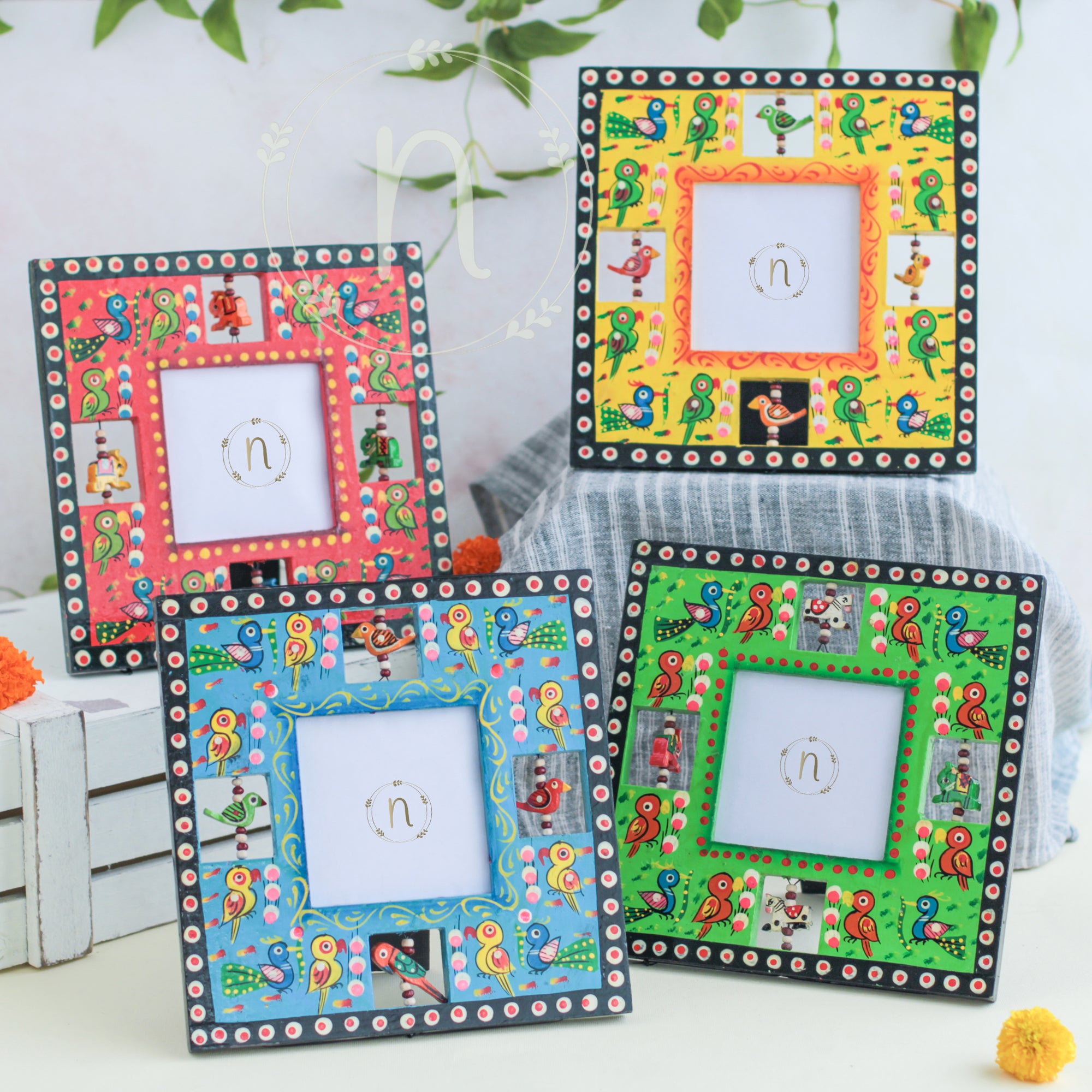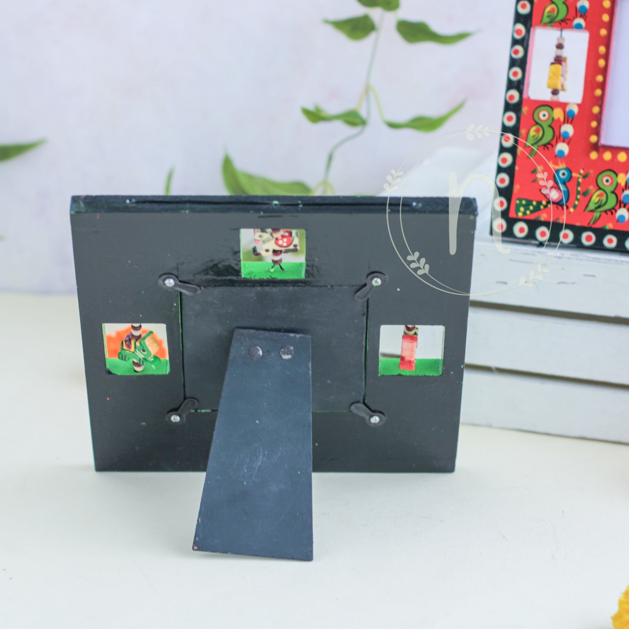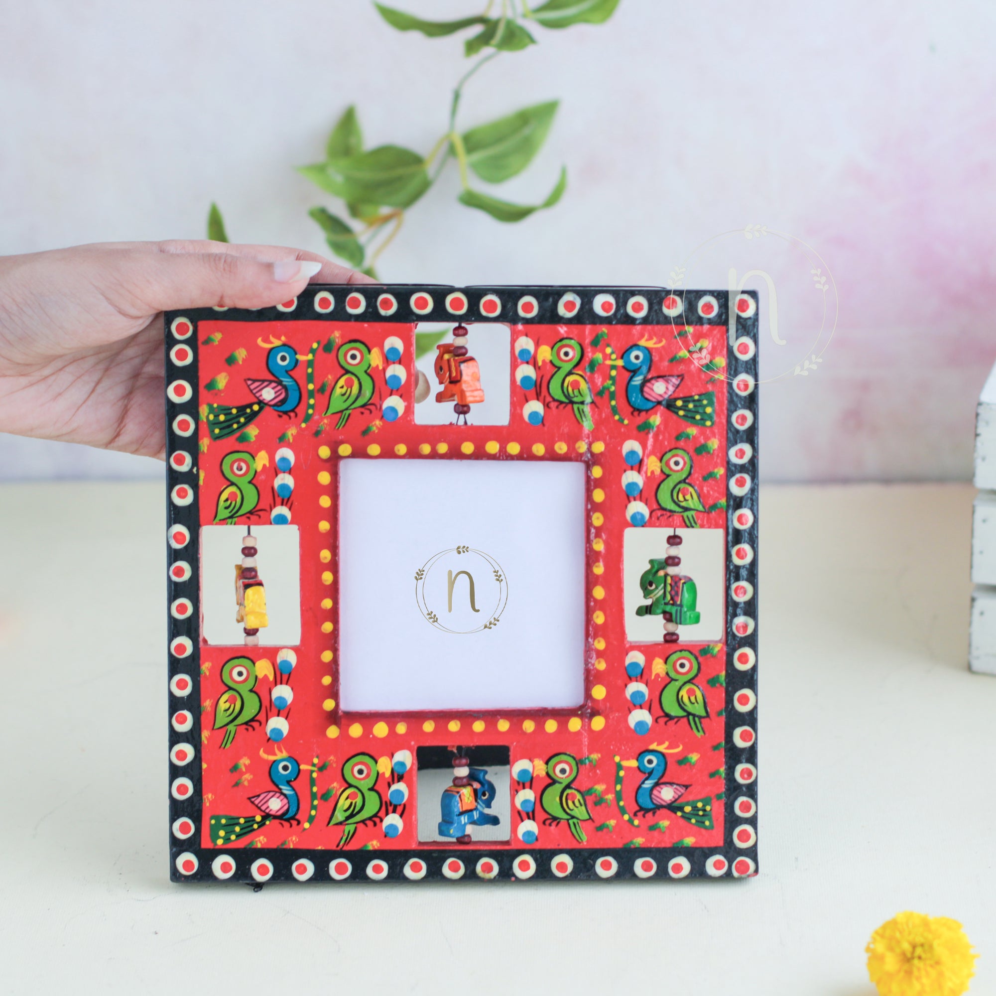 Wooden frame for treasured memories and pictures that comes in red, green, blue and yellow colours. The frames have wooden animal carvings around the rim that are rotating and give a quirky vibe to the photo frame. Place a picture of the special ones or photos from holidays or memorable events in the frame. The picture frame comes with a stand that can be placed anywhere in the house and will enliven the space with the pop of colours.