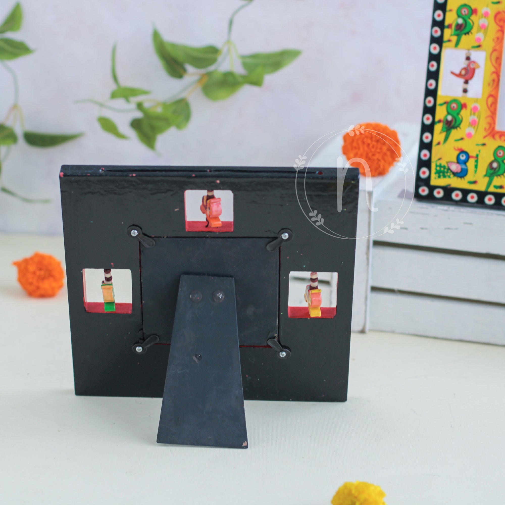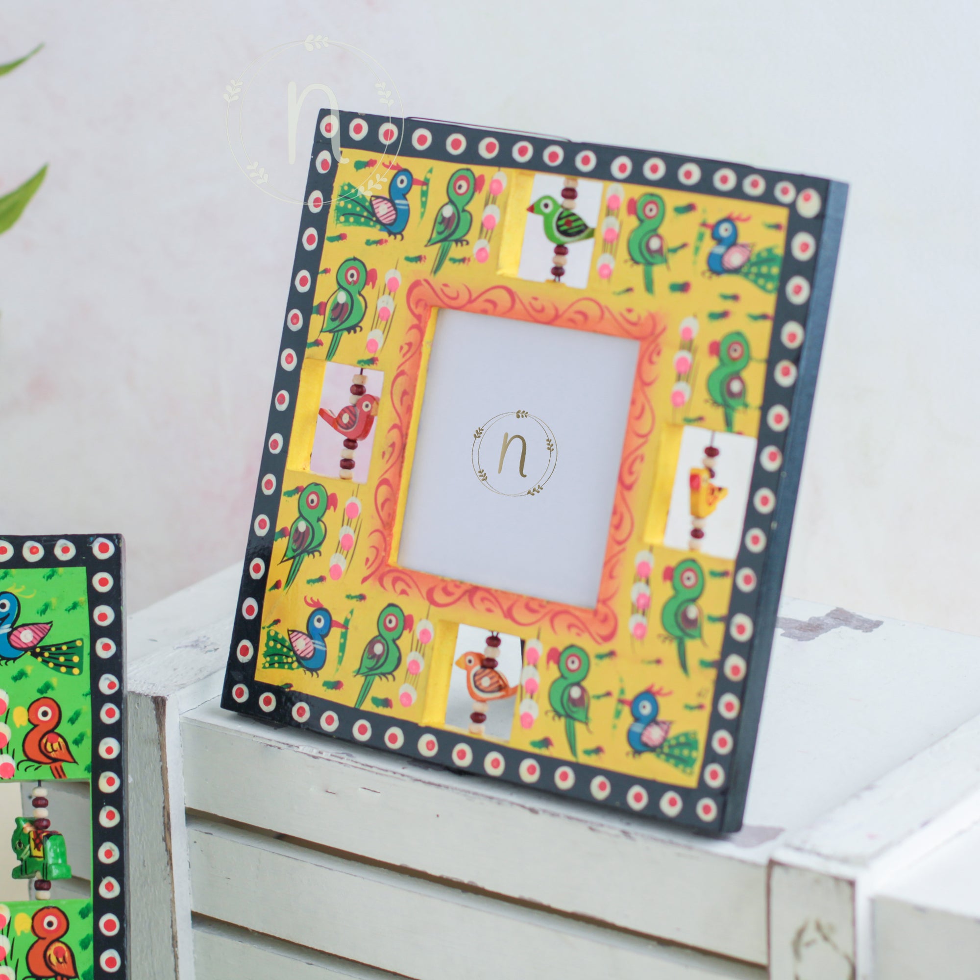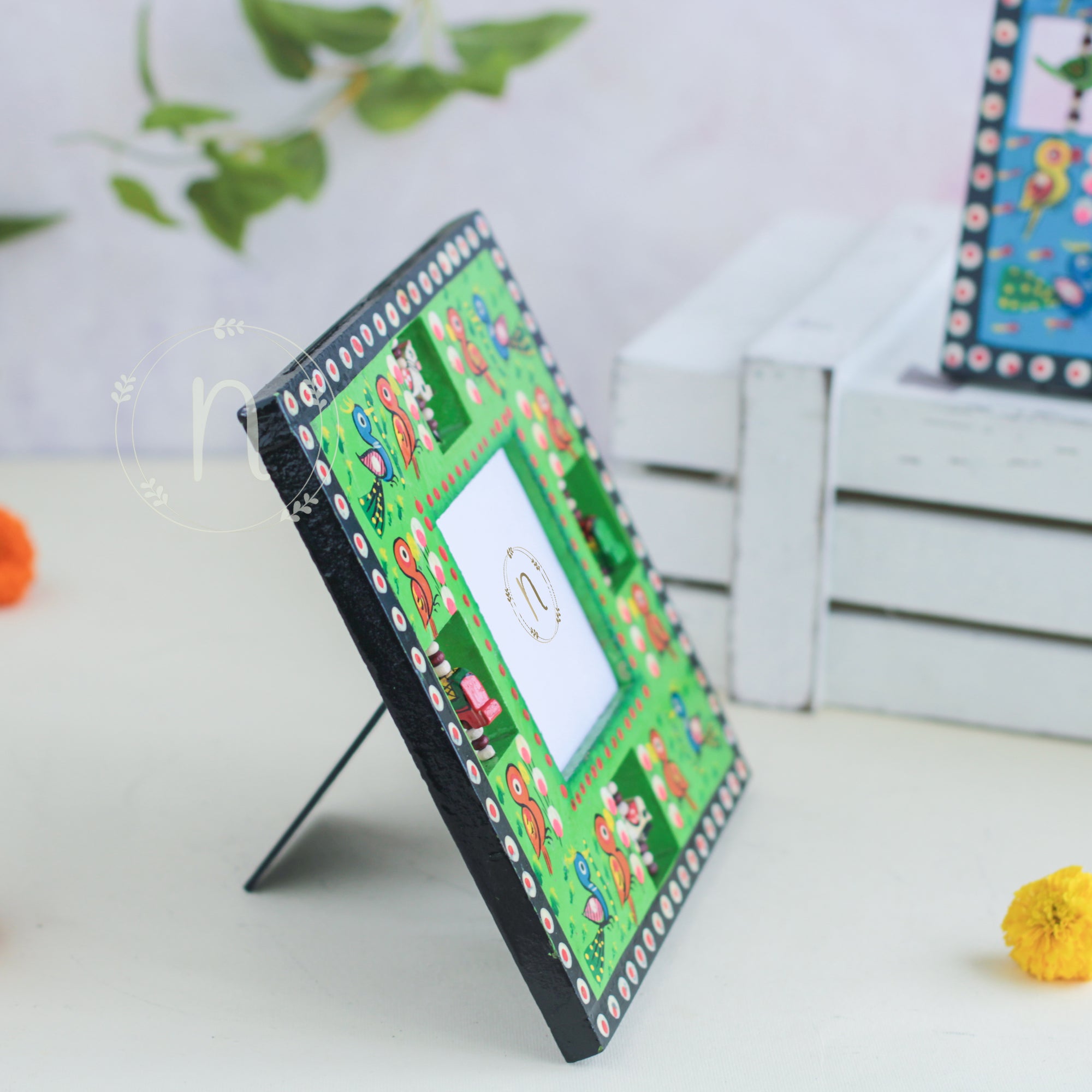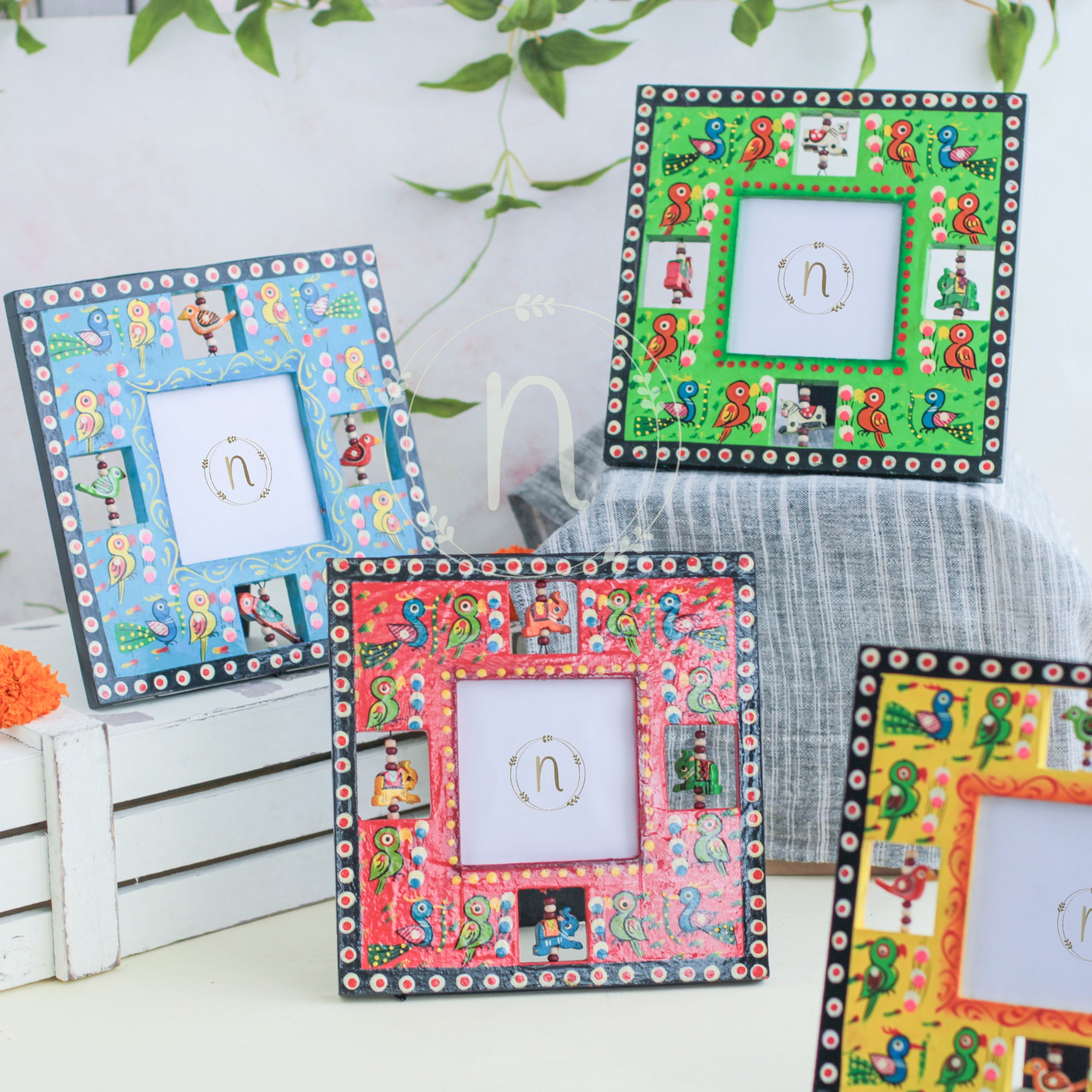 Wooden frame for treasured memories and pictures that comes in red, green, blue and yellow colours. The frames have wooden animal carvings around the rim that are rotating and give a quirky vibe to the photo frame. Place a picture of the special ones or photos from holidays or memorable events in the frame. The picture frame comes with a stand that can be placed anywhere in the house and will enliven the space with the pop of colours.