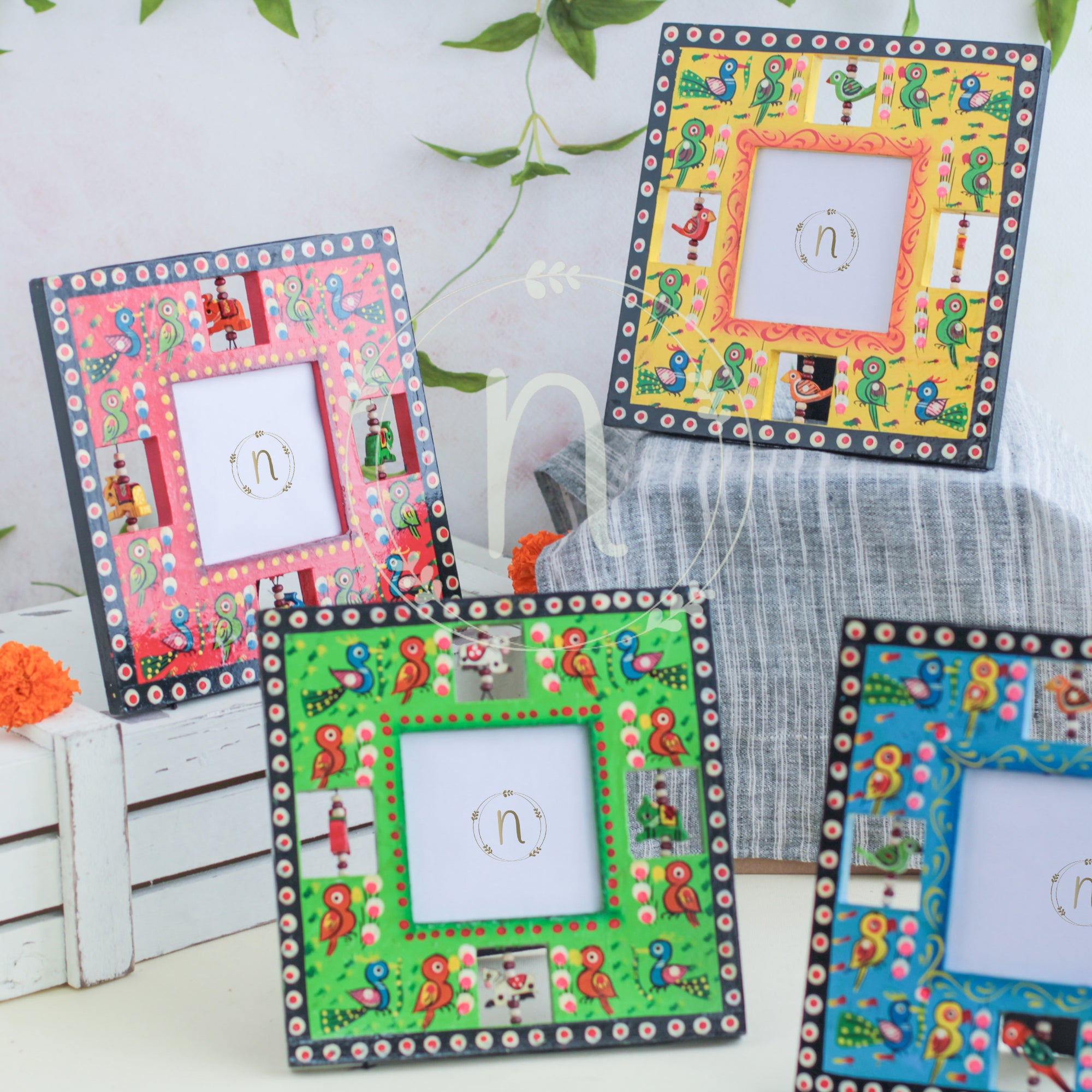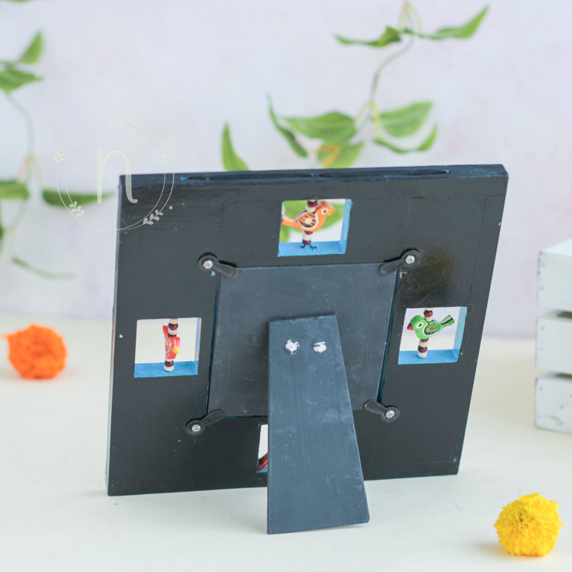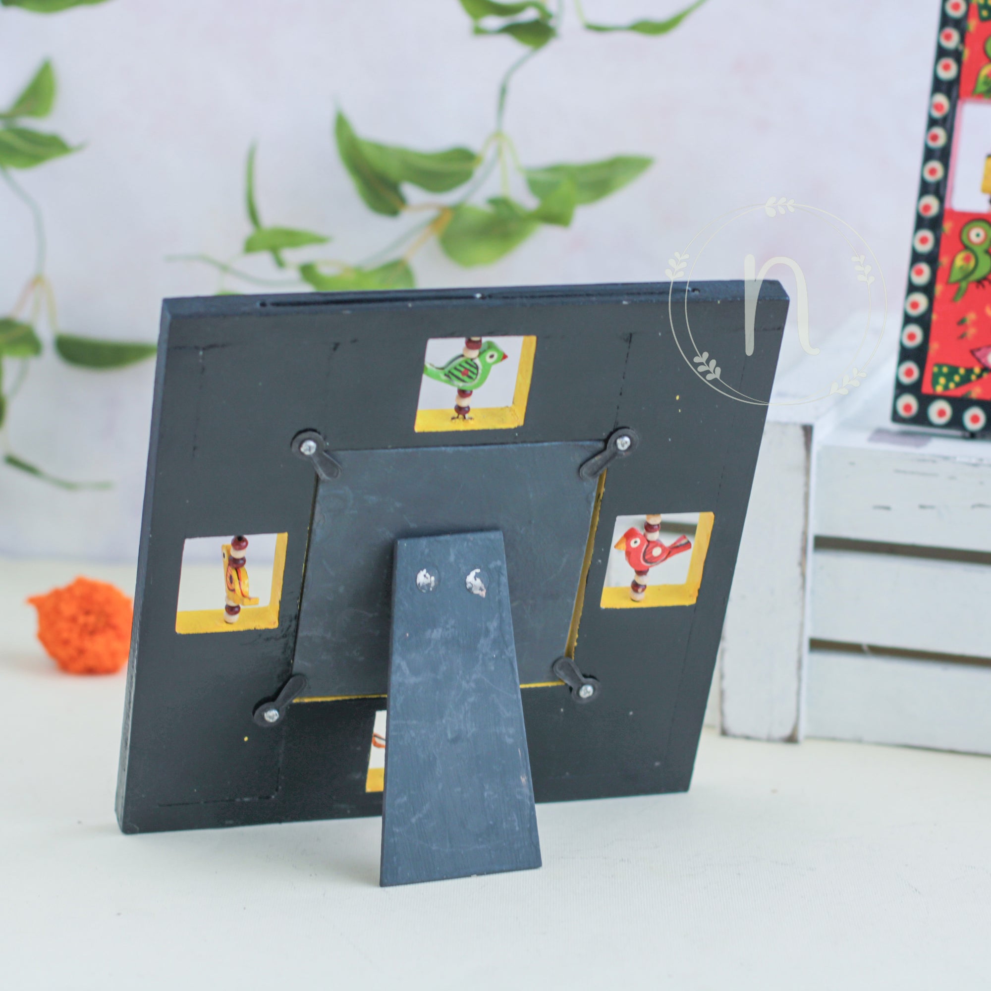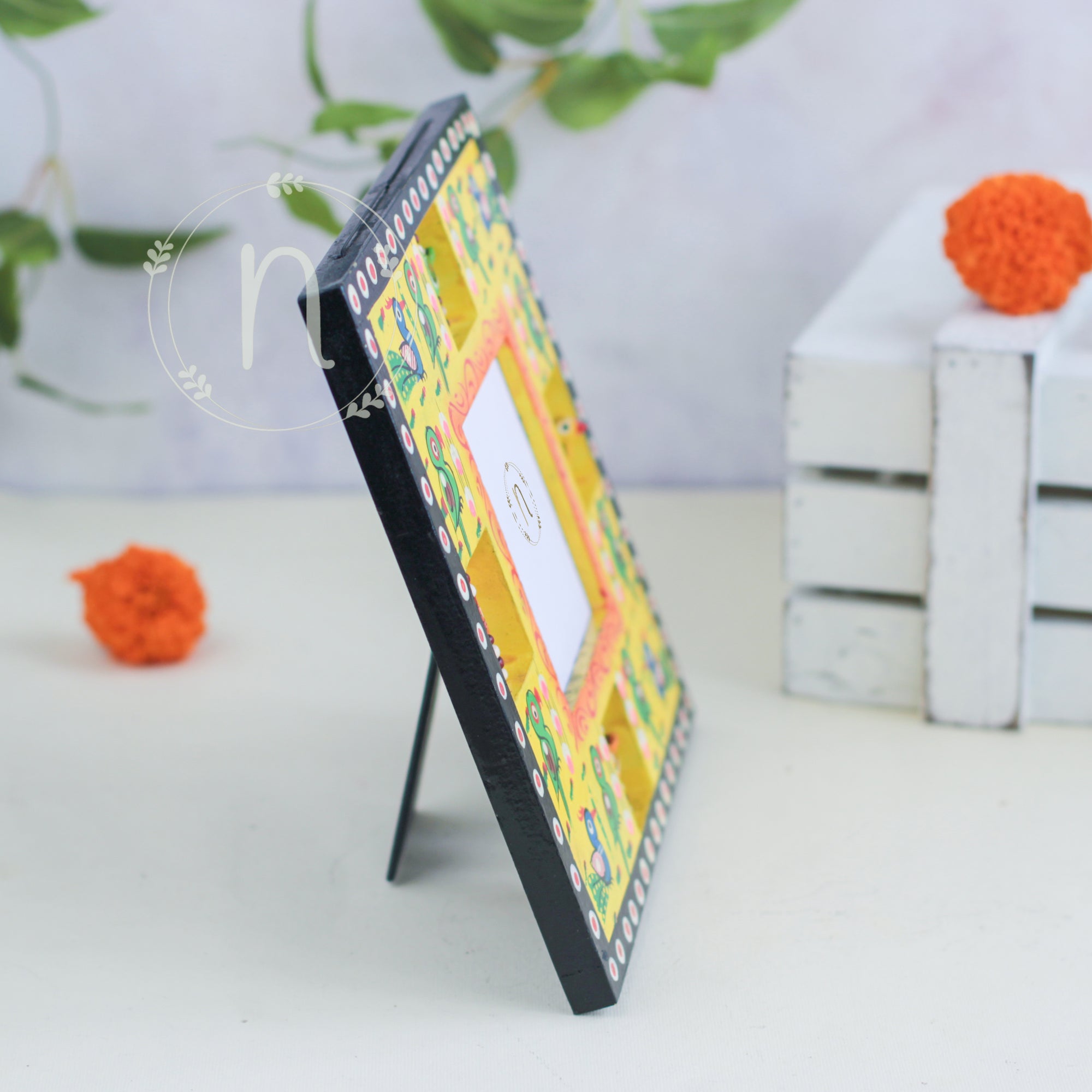 Wooden frame for treasured memories and pictures that comes in red, green, blue and yellow colours. The frames have wooden animal carvings around the rim that are rotating and give a quirky vibe to the photo frame. Place a picture of the special ones or photos from holidays or memorable events in the frame. The picture frame comes with a stand that can be placed anywhere in the house and will enliven the space with the pop of colours.