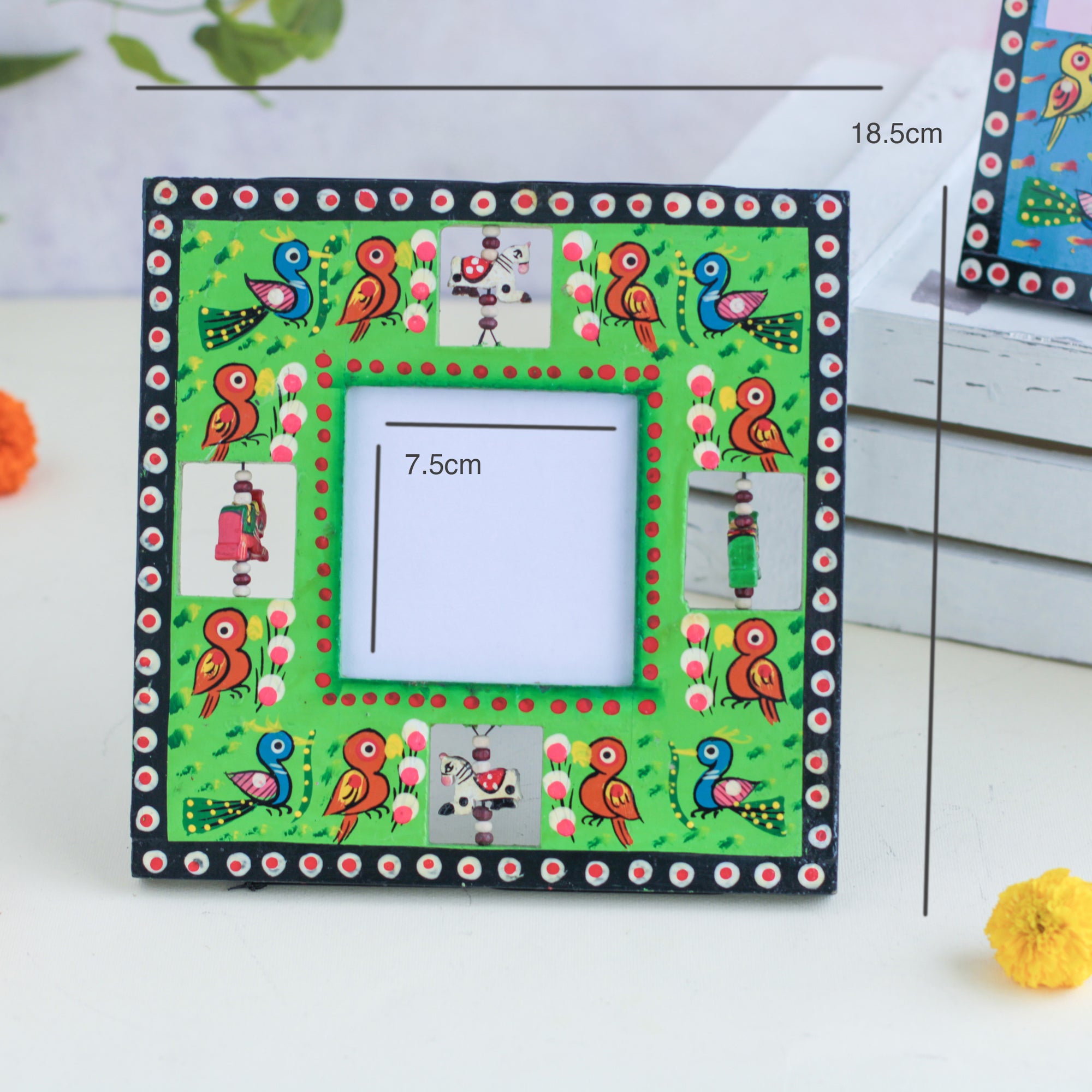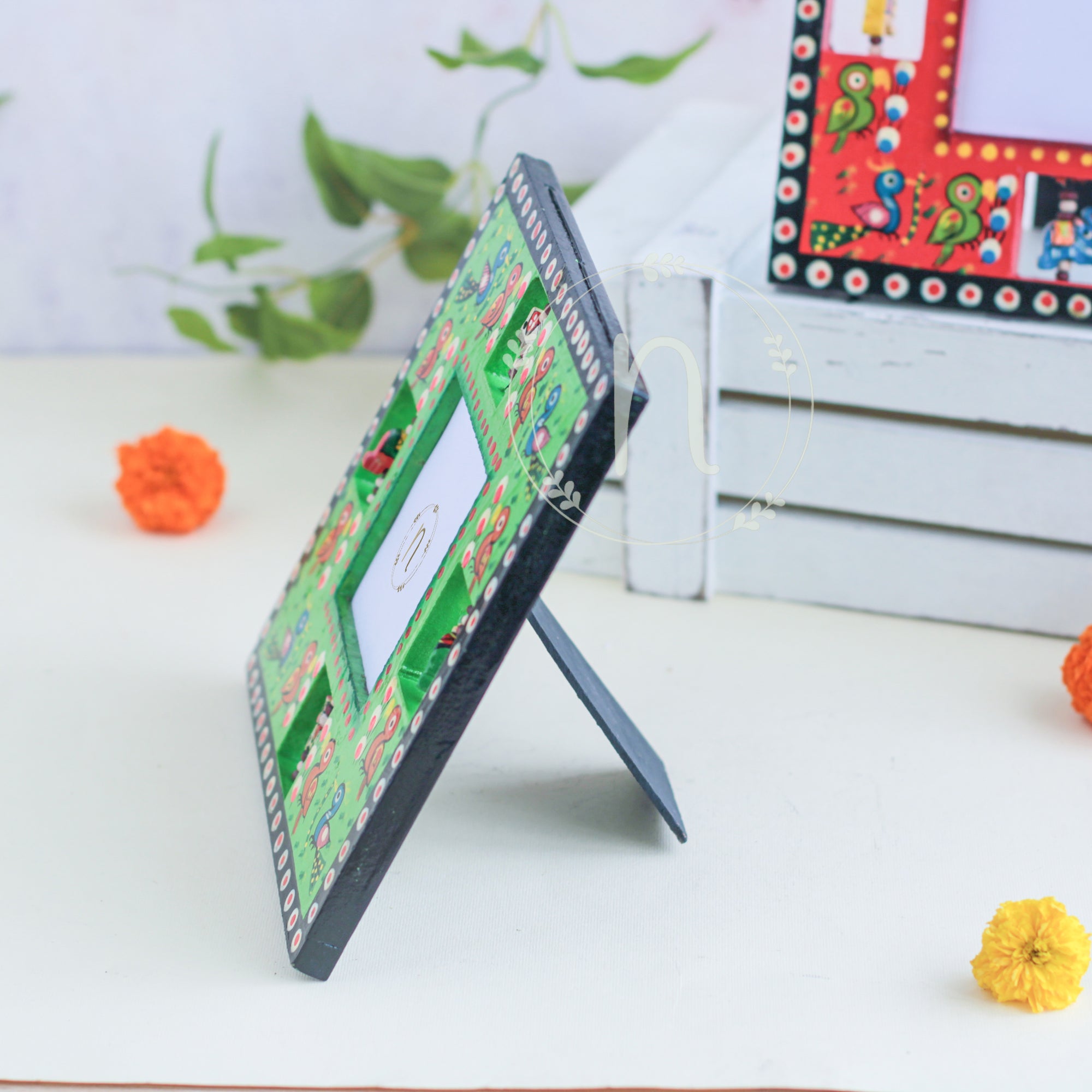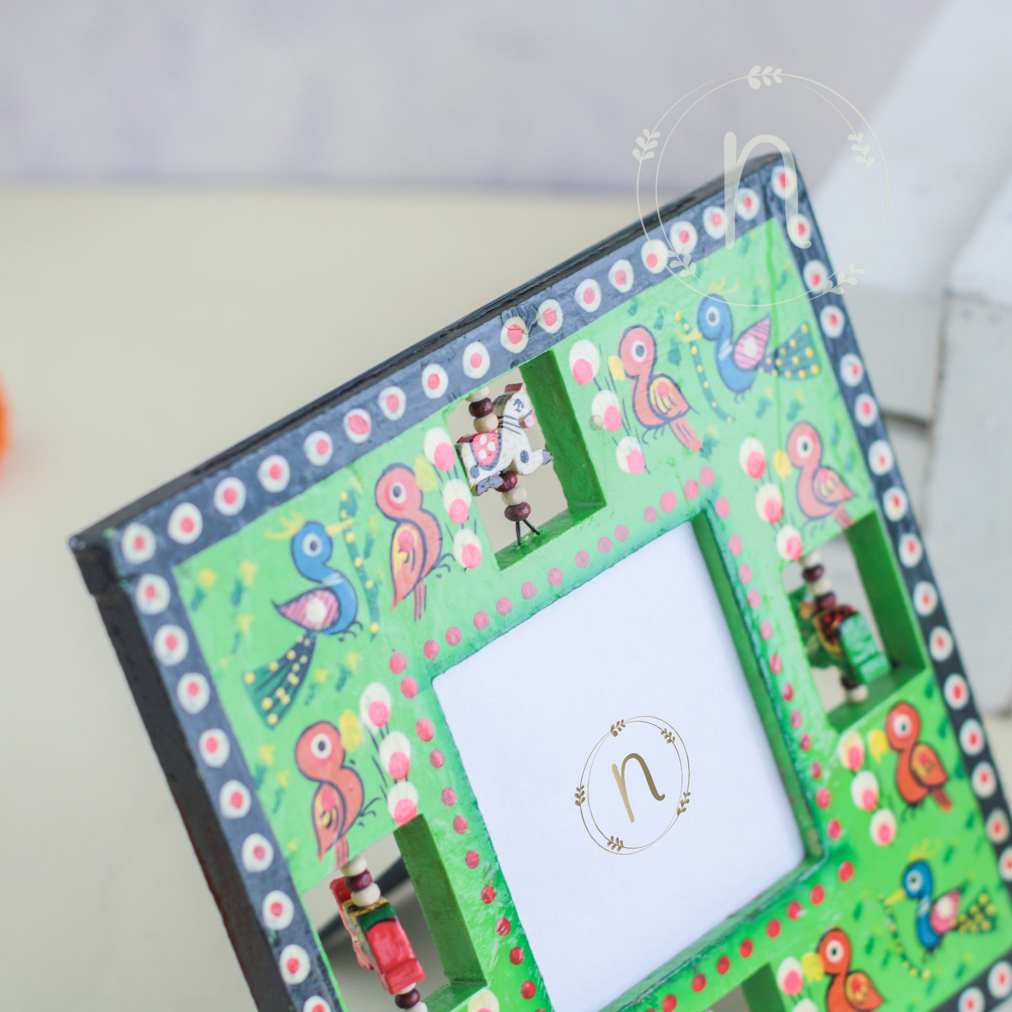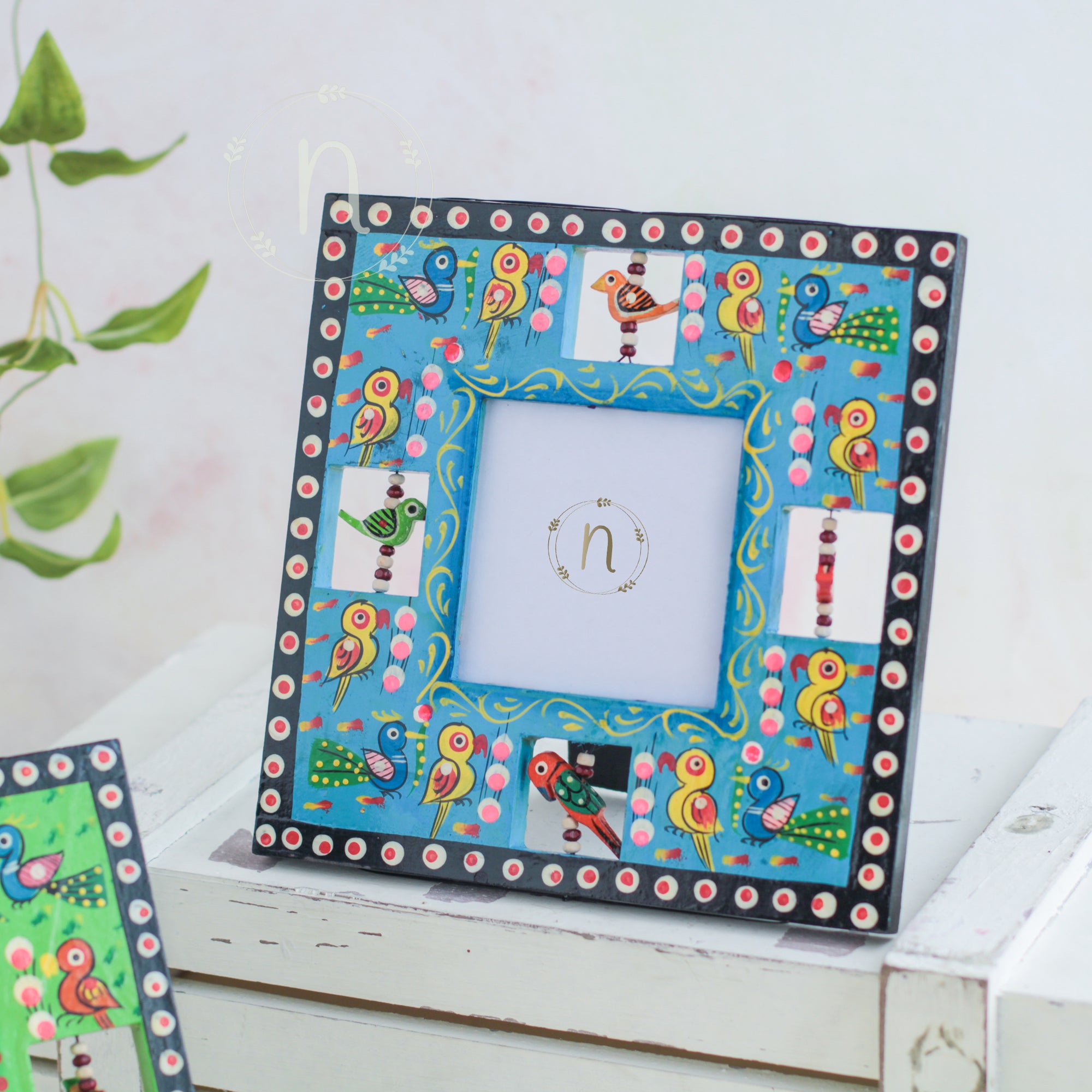 Wooden frame for treasured memories and pictures that comes in red, green, blue and yellow colours. The frames have wooden animal carvings around the rim that are rotating and give a quirky vibe to the photo frame. Place a picture of the special ones or photos from holidays or memorable events in the frame. The picture frame comes with a stand that can be placed anywhere in the house and will enliven the space with the pop of colours.