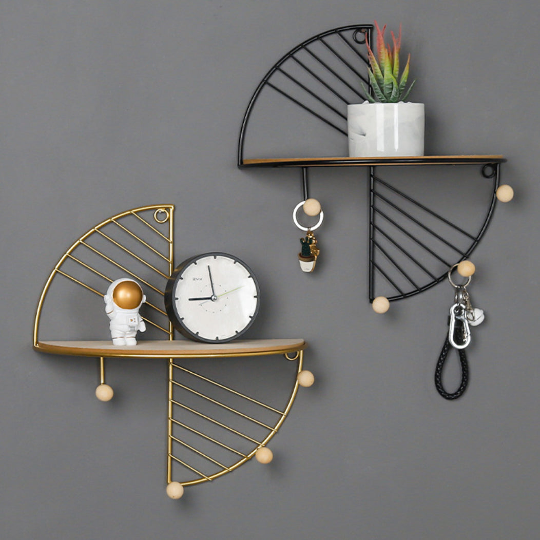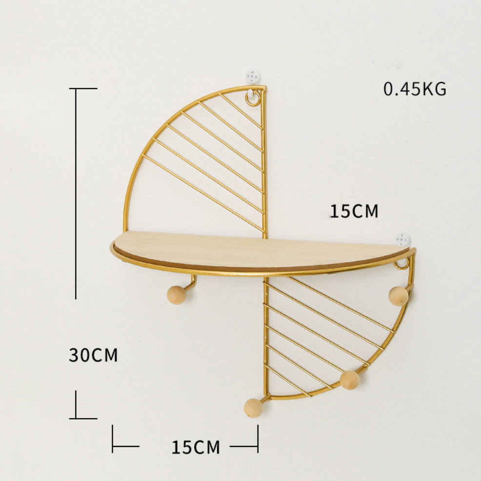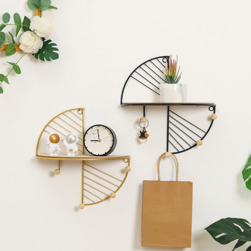Wooden wall shelf that has a metal frame and 4 hooks. The wall shelf can add element to a dull wall and can hold show pieces, planters, keys, stoles, scarves, belts and small bags. The metal and wood shelf is not only a utility product but also is a great decor ornament for the wall as the design looks stylish and unique. Nestip: Place a photo frame with a treasured memory and light up the shelf with rice lightsSize: 30cm L - wall shelf, 30cm diameter - wooden plankMaterial: metal and woodColour: black and gold with natural woodItems Included: 1 wall rackStyle: Gold - ZHL16M24 Black - ZHL16M25