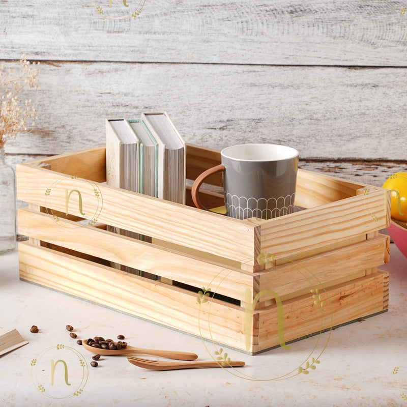 Multipurpose wooden container constructed of high-quality wood that comes in two light shades and is an exceptionally beneficial addition to any home. Toiletries, make-up, cutlery, clothes and other items can be stored in the wooden storage box. The wooden crate box is both lightweight and durable, and can be used to store anything from books to plants to wine bottles. The open tray can also be used as a serving tray at dinner parties to keep beverage bottles and juice dispensers.