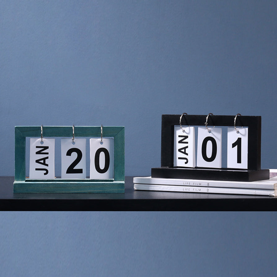 A wooden table top calendar with changeable dates to be used as a display piece on a table, shelf or display unit. The calendars are interactive pieces and can also be used at an office or home to tell the date and day. The calendars can also be used for gifting to colleagues, friends and family.