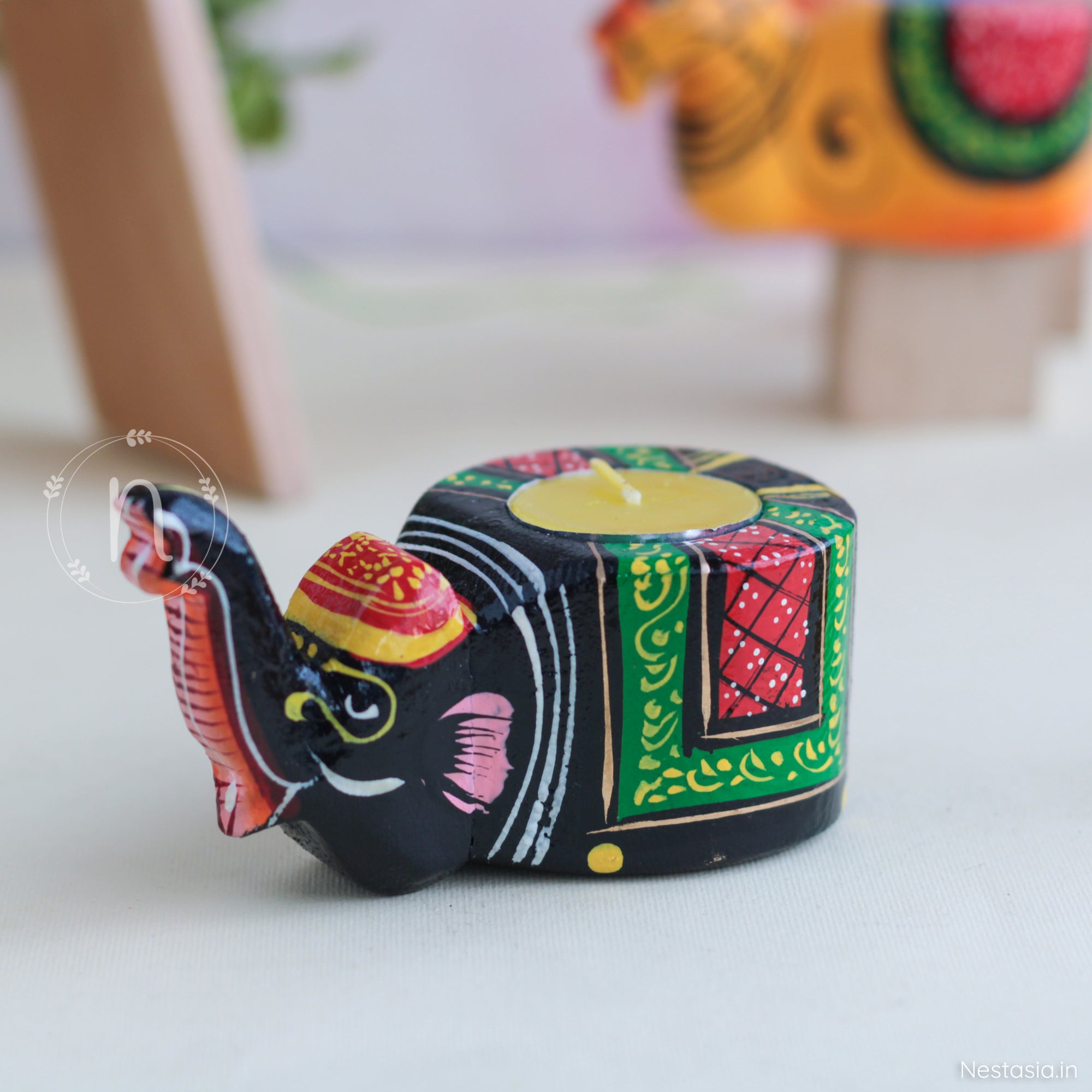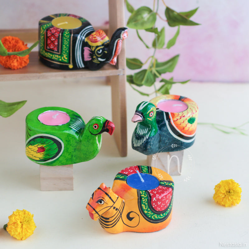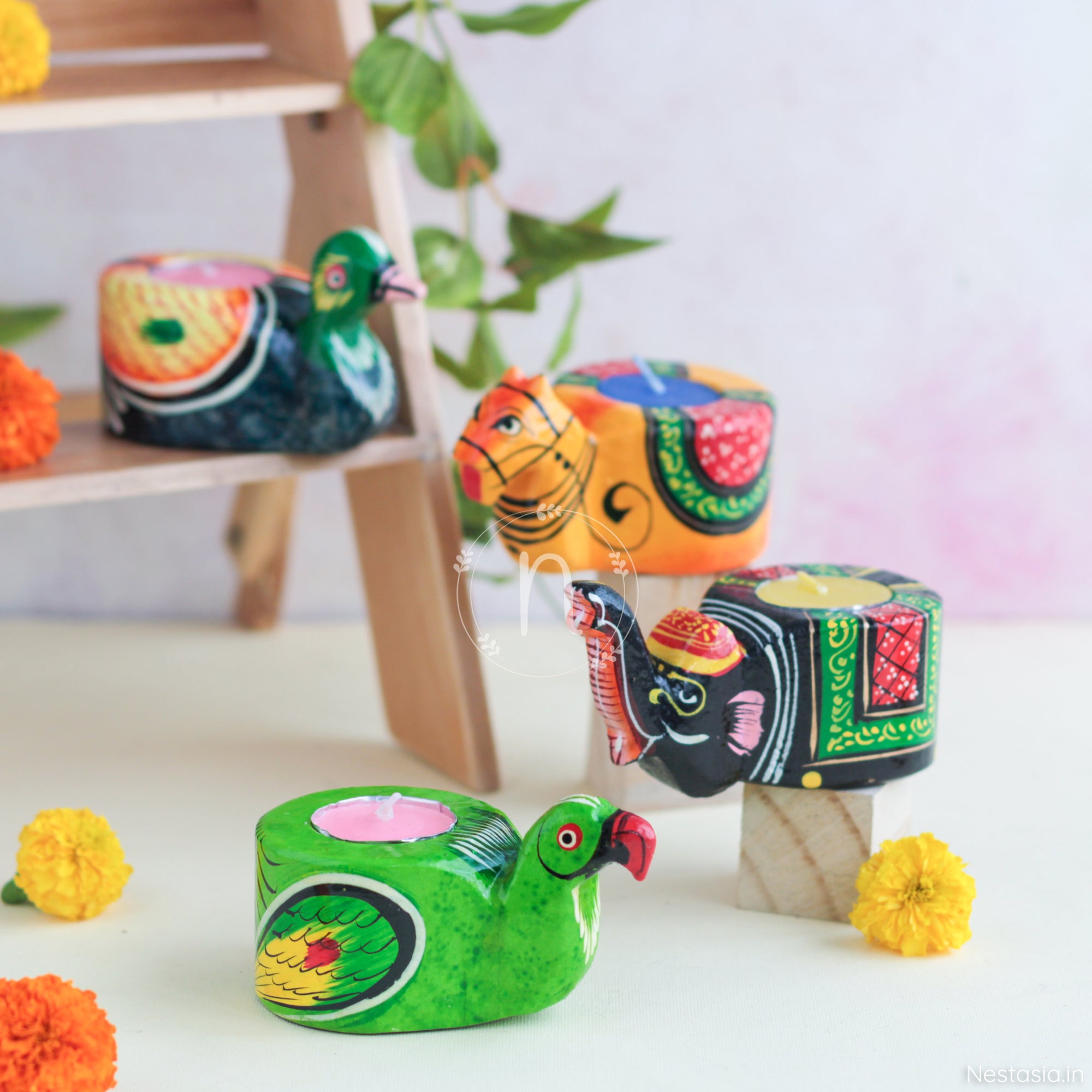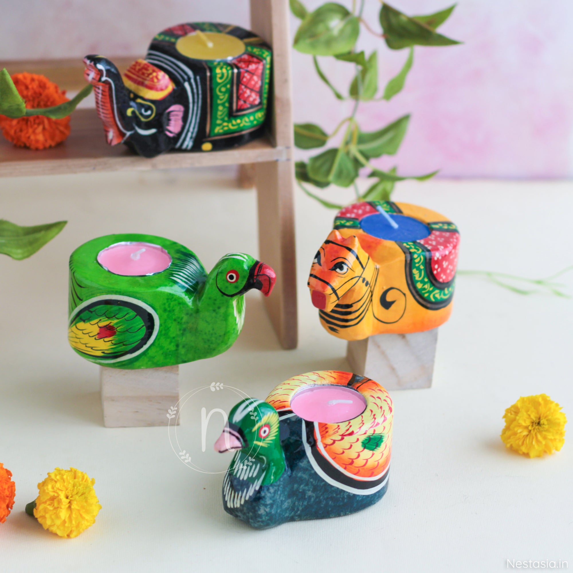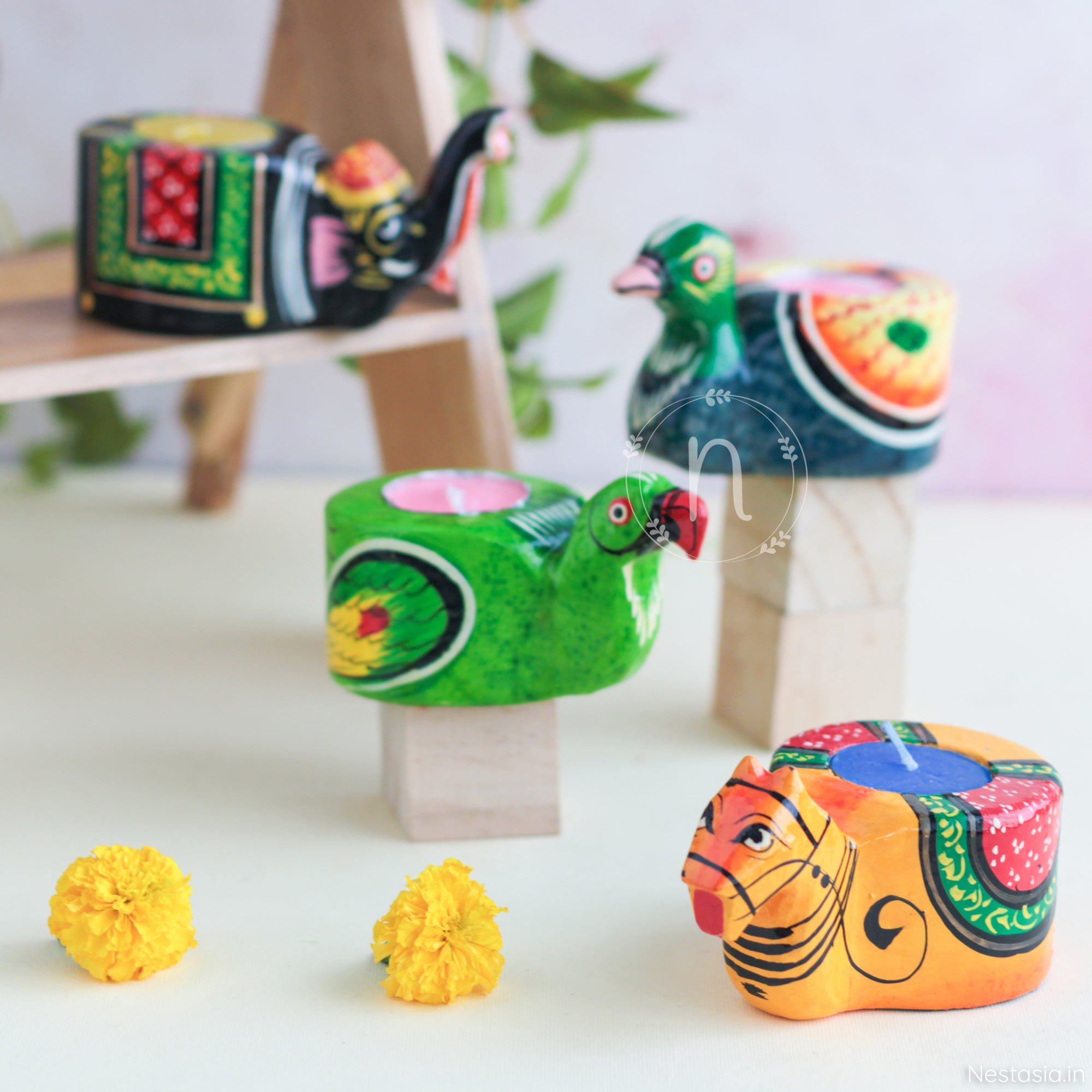 Tea light holders that are made in wood and carved into animals like an elephant, parrot, peacock and horse. The traditional looking tea light holders come with a tea light candle to enliven a decor setting with its majestic looks. The candle holder can also be used as decor pieces without the tea light at home or for events and festivals.