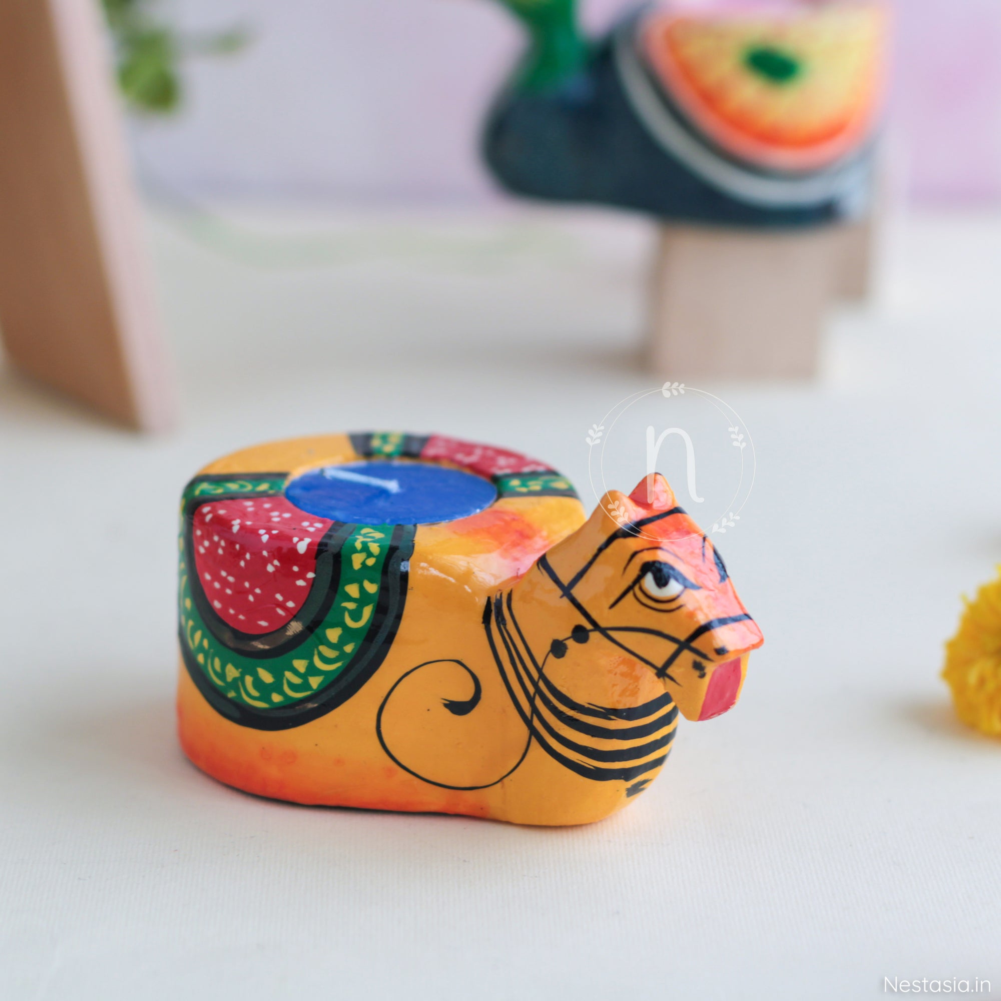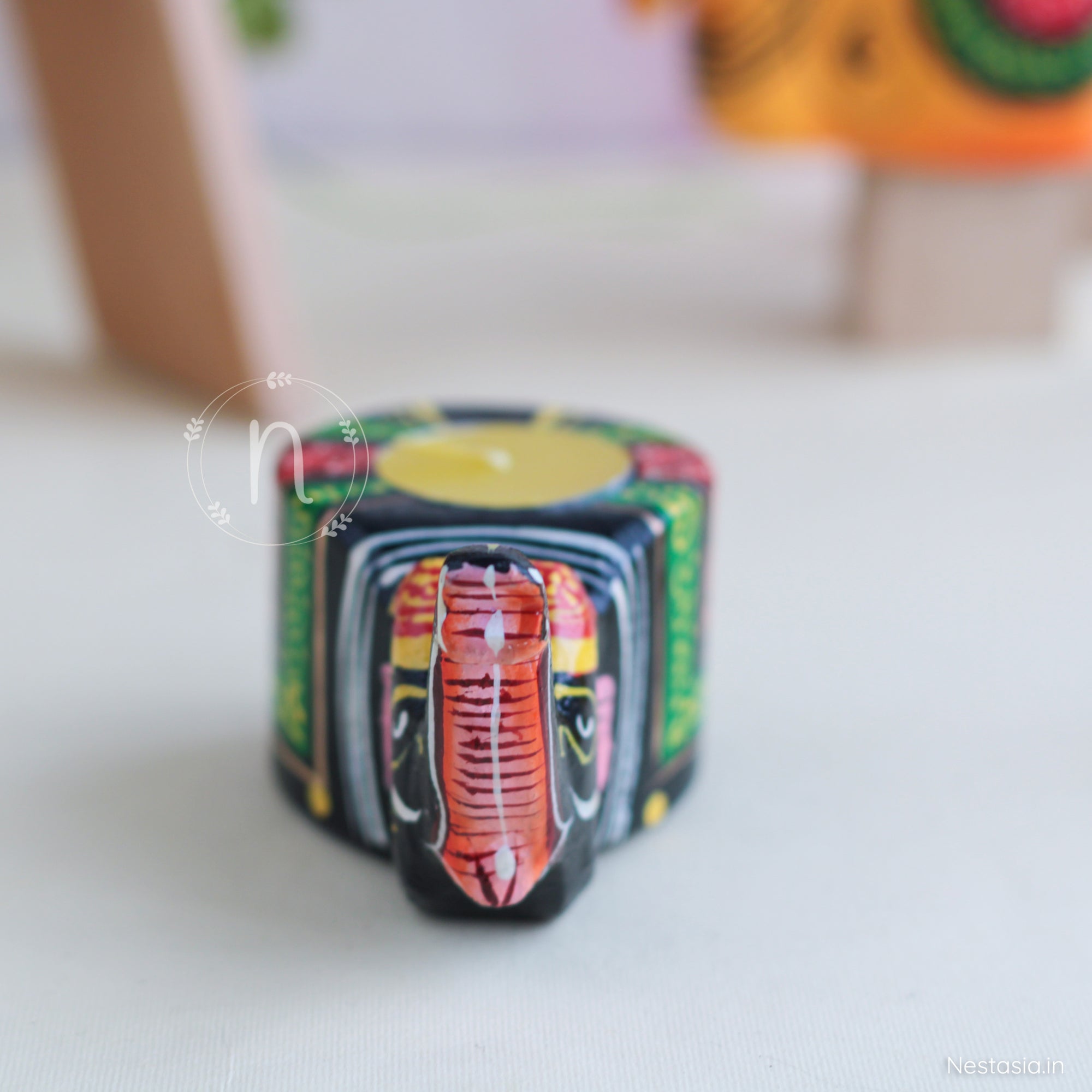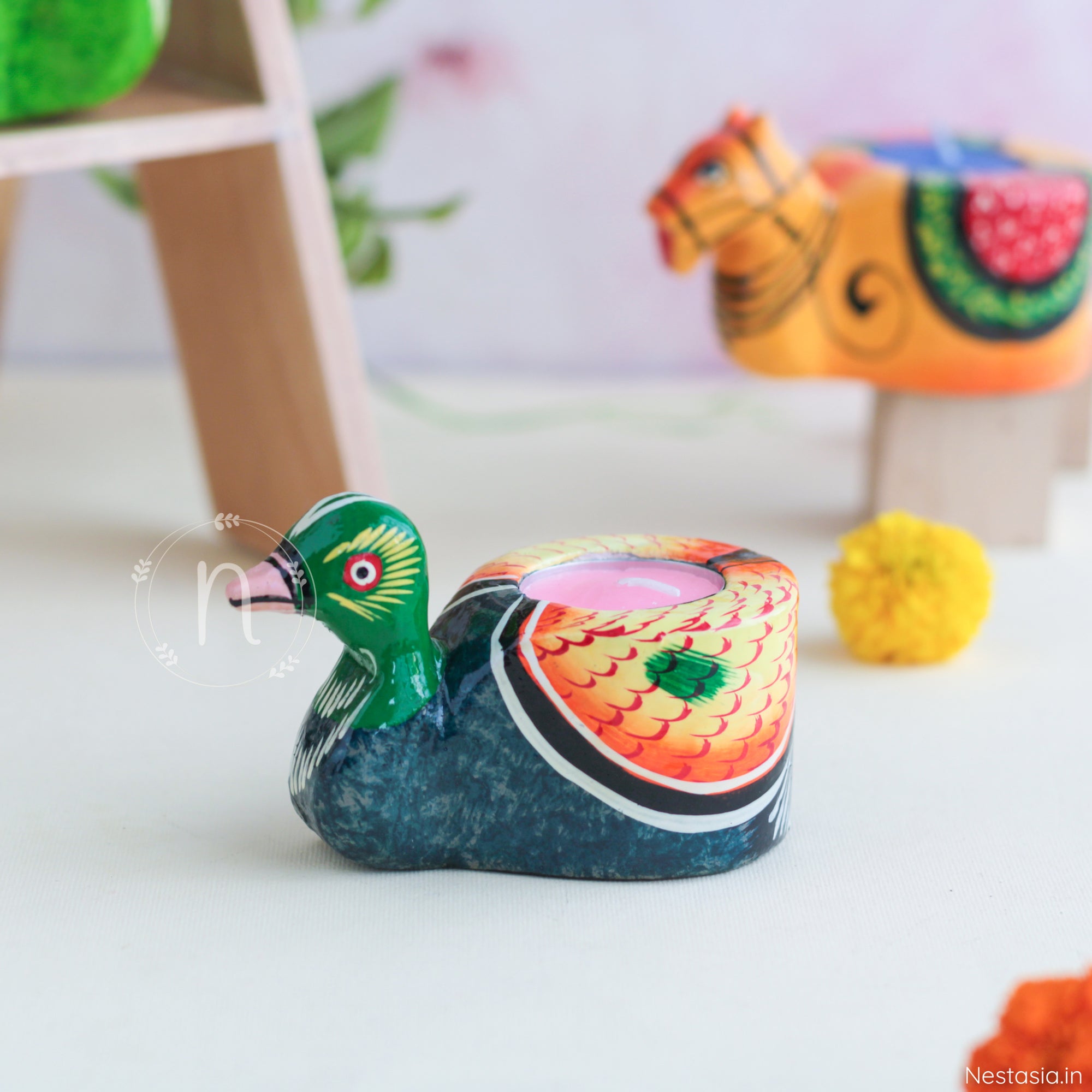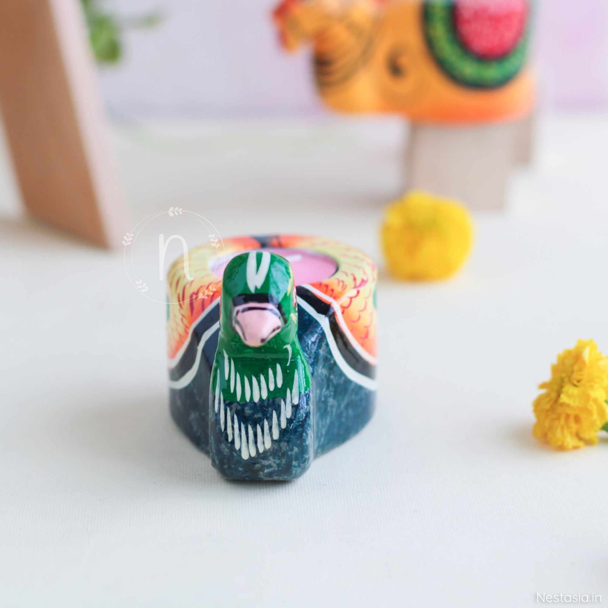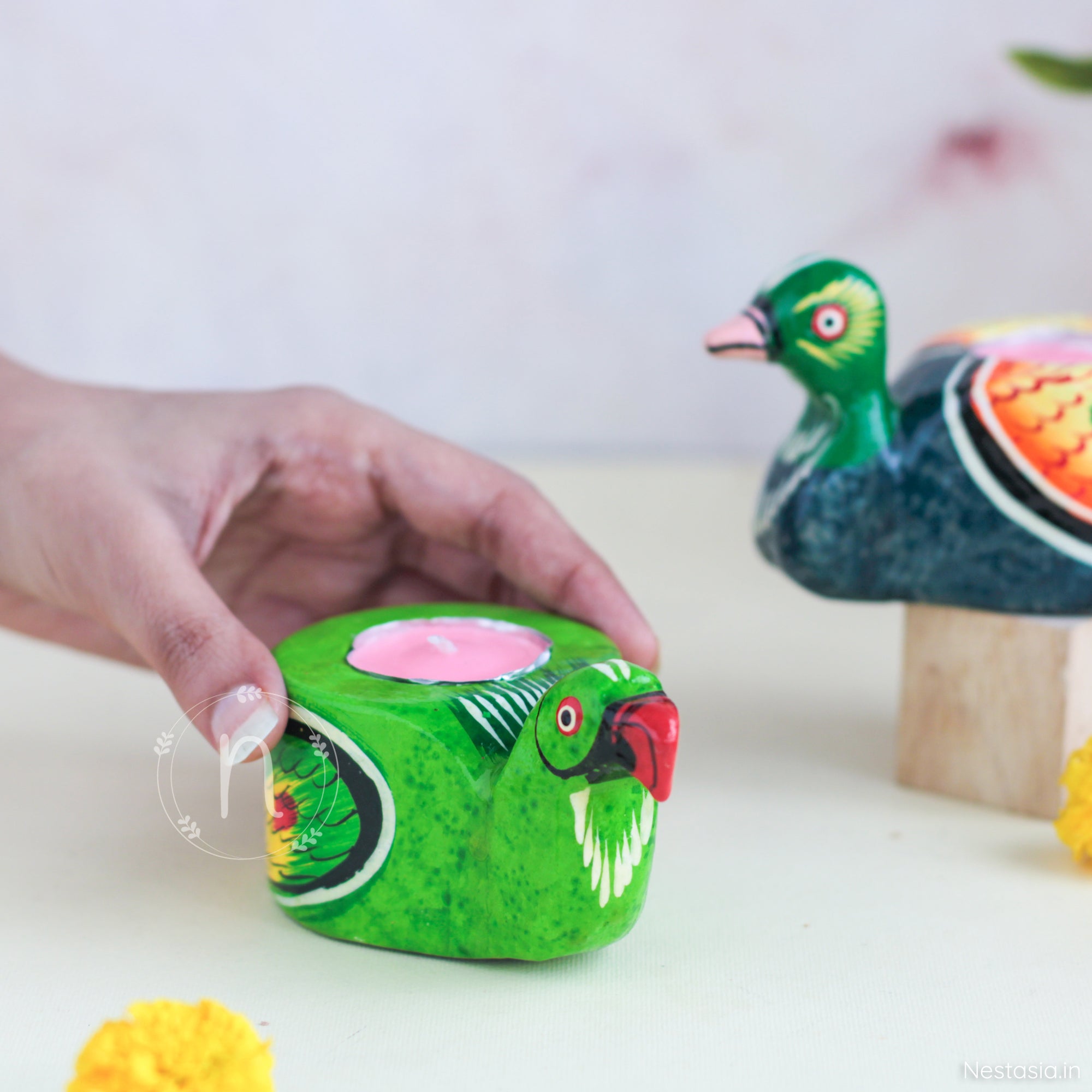 Tea light holders that are made in wood and carved into animals like an elephant, parrot, peacock and horse. The traditional looking tea light holders come with a tea light candle to enliven a decor setting with its majestic looks. The candle holder can also be used as decor pieces without the tea light at home or for events and festivals.