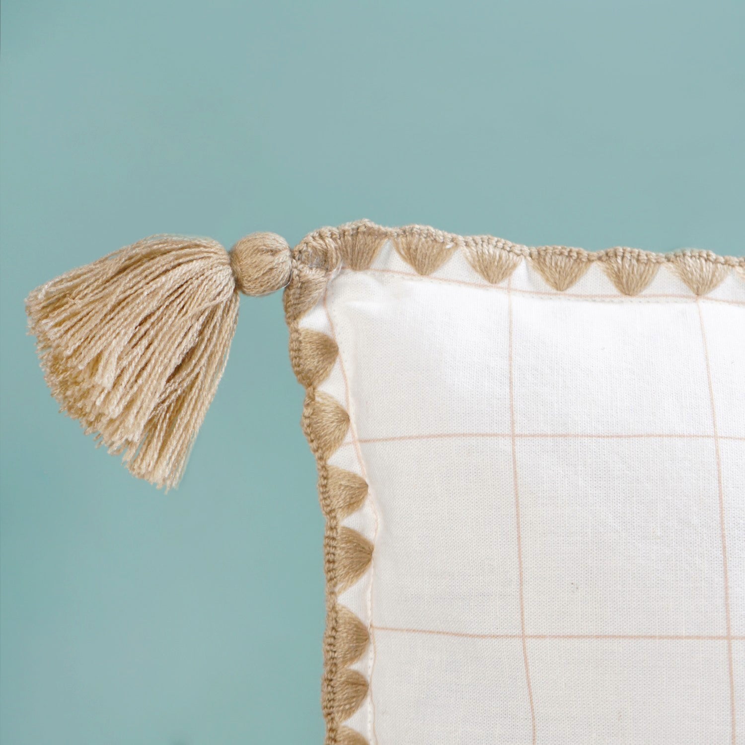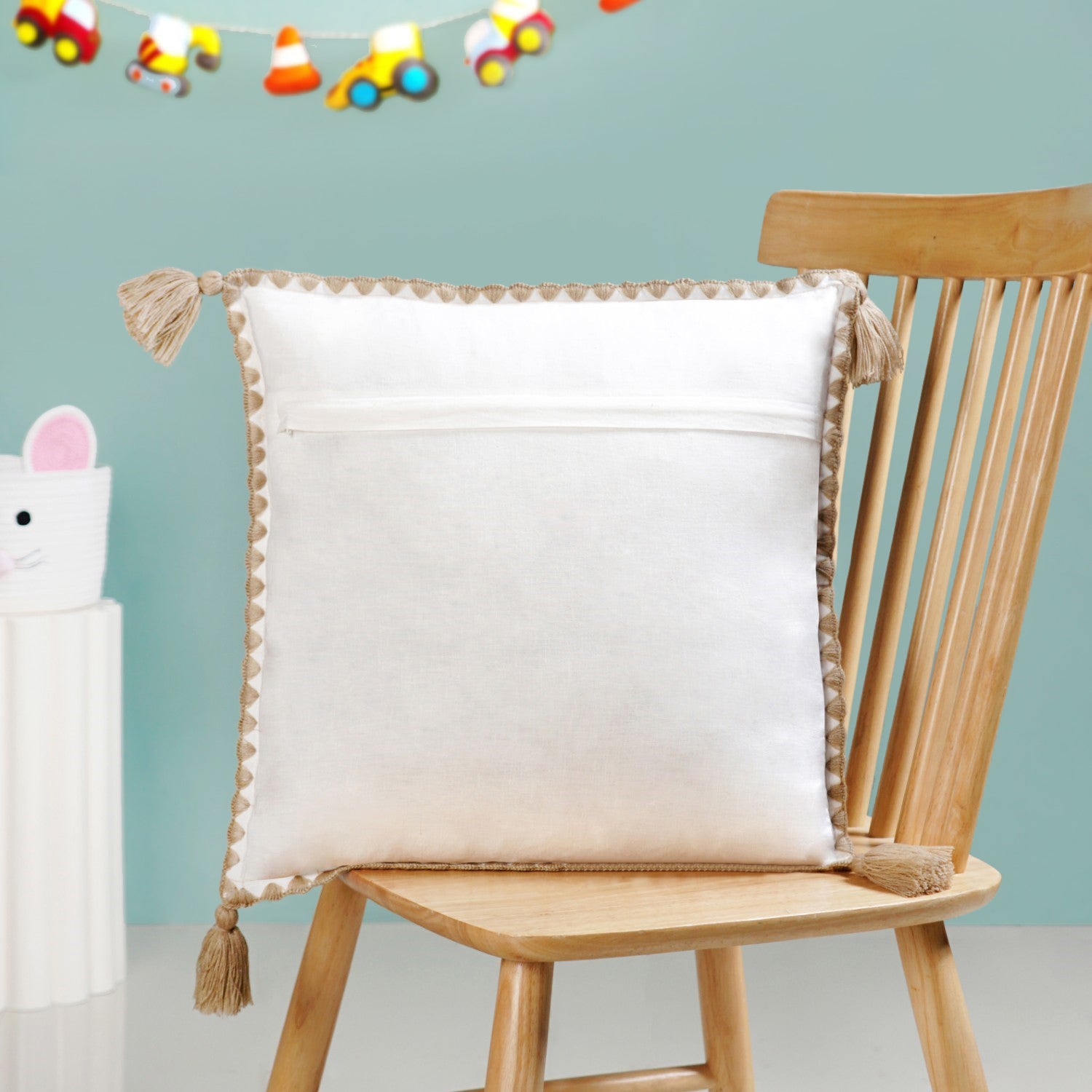Design: This kids' cushion cover is made from soft 100% cotton fabric, ensuring a gentle feel. The square shape is perfect for display, featuring a charming embroidered reindeer face with antlers against a checkered background. The cushion boasts peach-orange tassels on the corners and a neatly stitched, durable, brown embroidered border. The design uses natural cream and soft brown colours. This small-sized cover, ideal for children's spaces, features high-quality textured embroidery stitching and is washable for easy maintenance. The cover may experience slight shrinkage after washing, adding to its cosy, snug fit. A gentle press with an iron will help the cotton return to its original shape.
