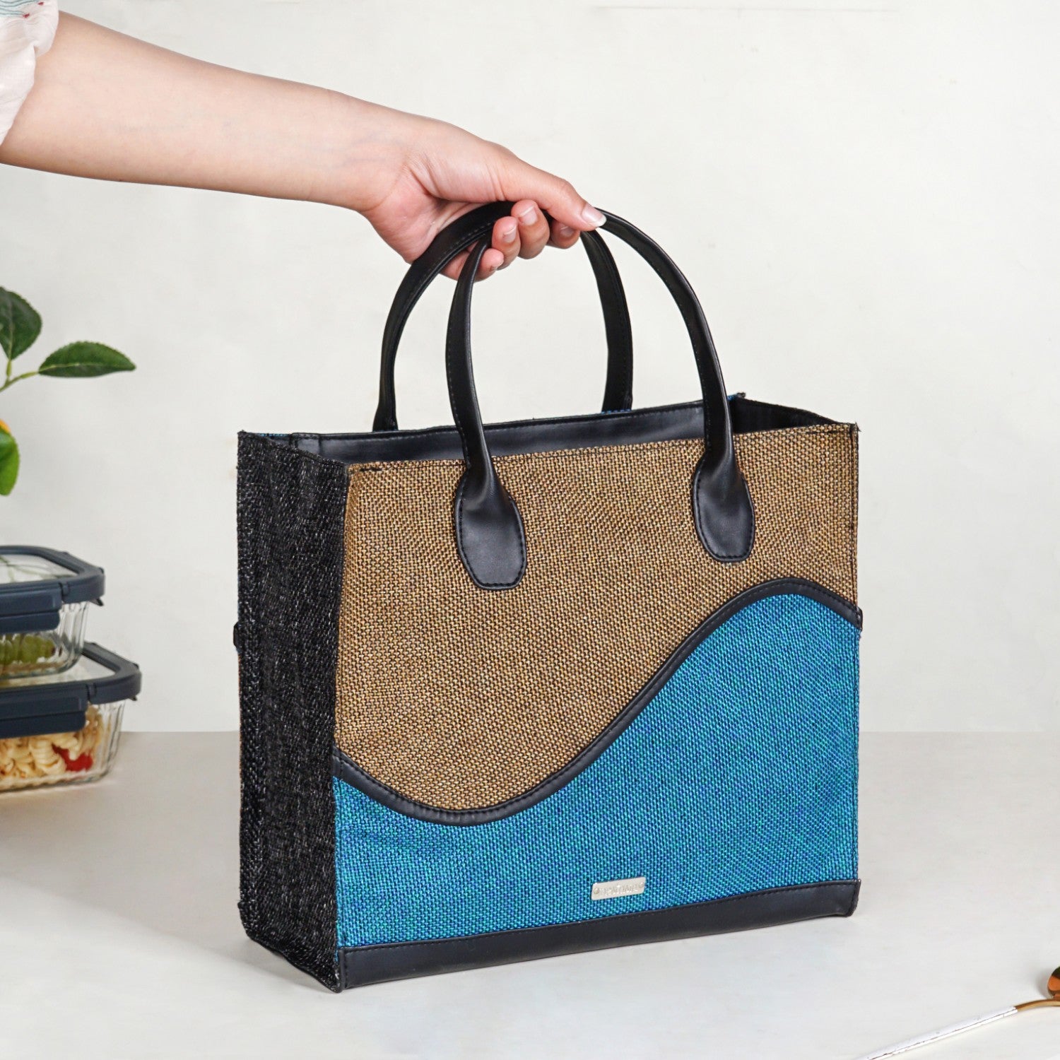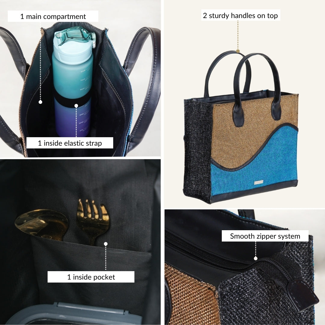 Design: This lunch bag has a distinctive blue and beige two-tone design, divided by a wavy vegan black leather strip. This abstract style offers a contemporary, gender-neutral style that suits everyone well. This lunch box bag comes with two sturdy handle straps that have a perfect grip and make it easy as well as comfortable to carry. There is one main compartment with polyester lining, which is very spacious and has a special elastic strap on one side to hold a bottle in place. On the other side, there’s a small pocket with enough room to keep extra items like cutlery, napkins, or snacks. The bottom of the bag is also covered with vegan leather to make it stronger and more durable.
