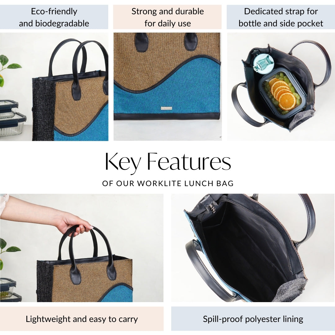 Benefit: Made from vegan leather, this bag is a stylish, cruelty-free alternative to traditional leather and a durable upgrade from disposable plastic bags. The design of the lunch bag is unisex, giving it a universally appealing appearance. With a small pocket for cutlery or any other accessories, it also has a separate space to carry water. Moreover, the bag in itself is very lightweight, which makes it easy to carry. Due to its inner polyester lining, it is heat-resistant. The bag is also easy to clean with a damp cloth. Since it’s reusable, this bag also helps you save money over time and avoid using disposable lunch bags every day.