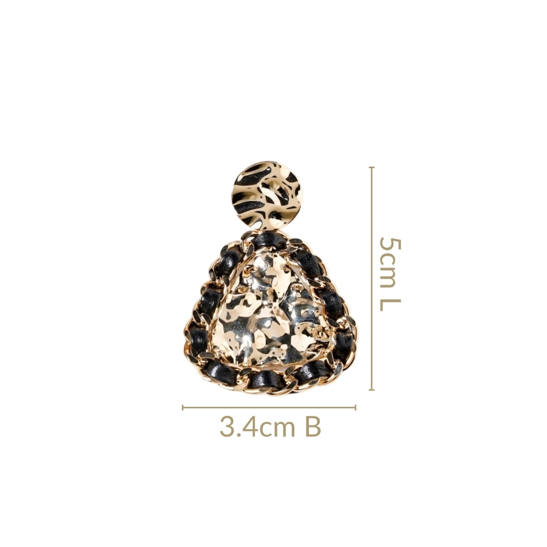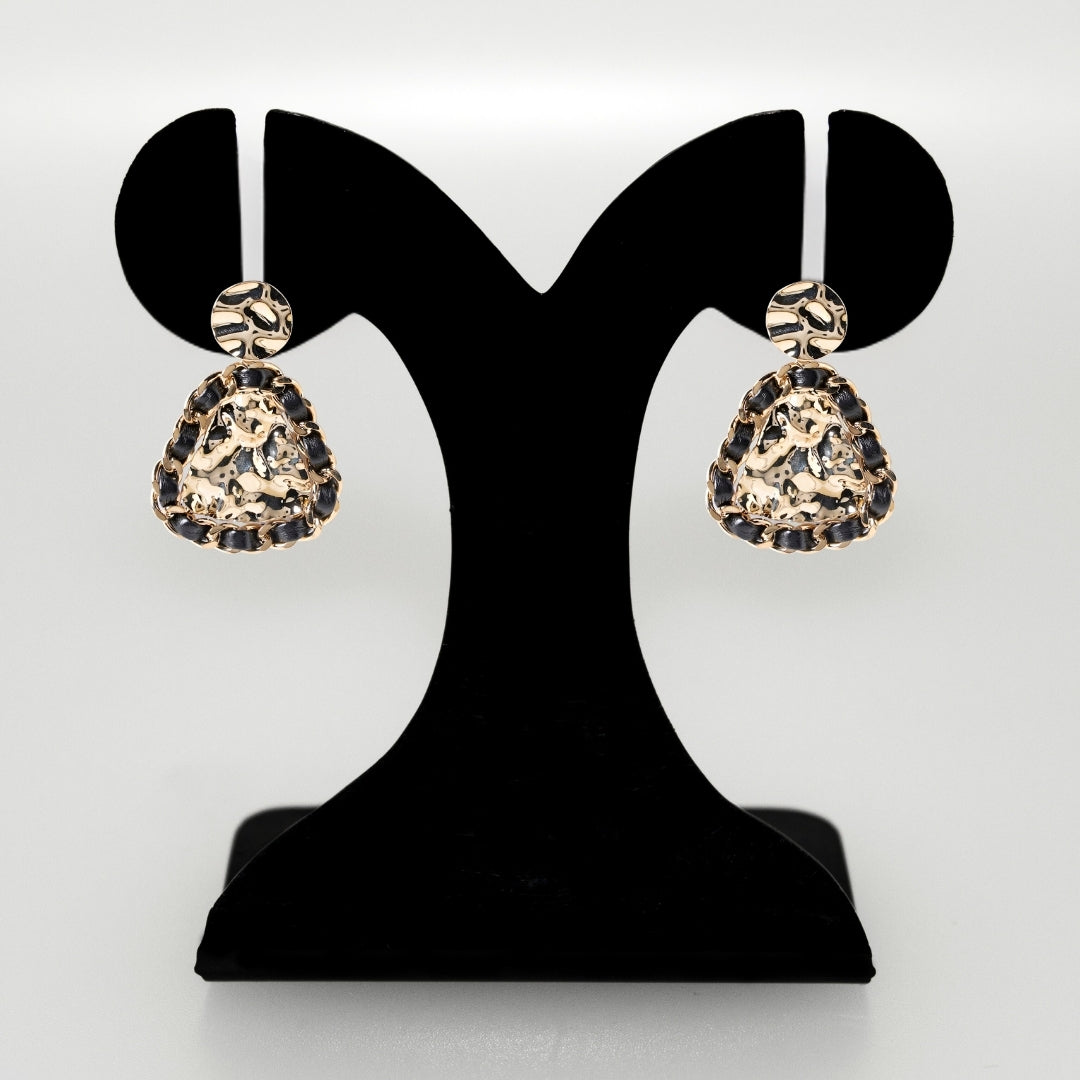 Sleek and sophisticated, these chic dangler earrings make a bold contemporary statement. The solid gold, lightly dented metal upper portion exudes elegance, while the abstract, dented lower dangler adds depth and modern flair. Wrapped in black PU leather that crosses around it, the lower piece creates a striking contrast, blending edgy and refined elements effortlessly. Perfect for making a statement, these earrings offer a contemporary twist on classic elegance, ideal for both casual and formal occasions.