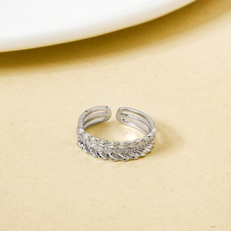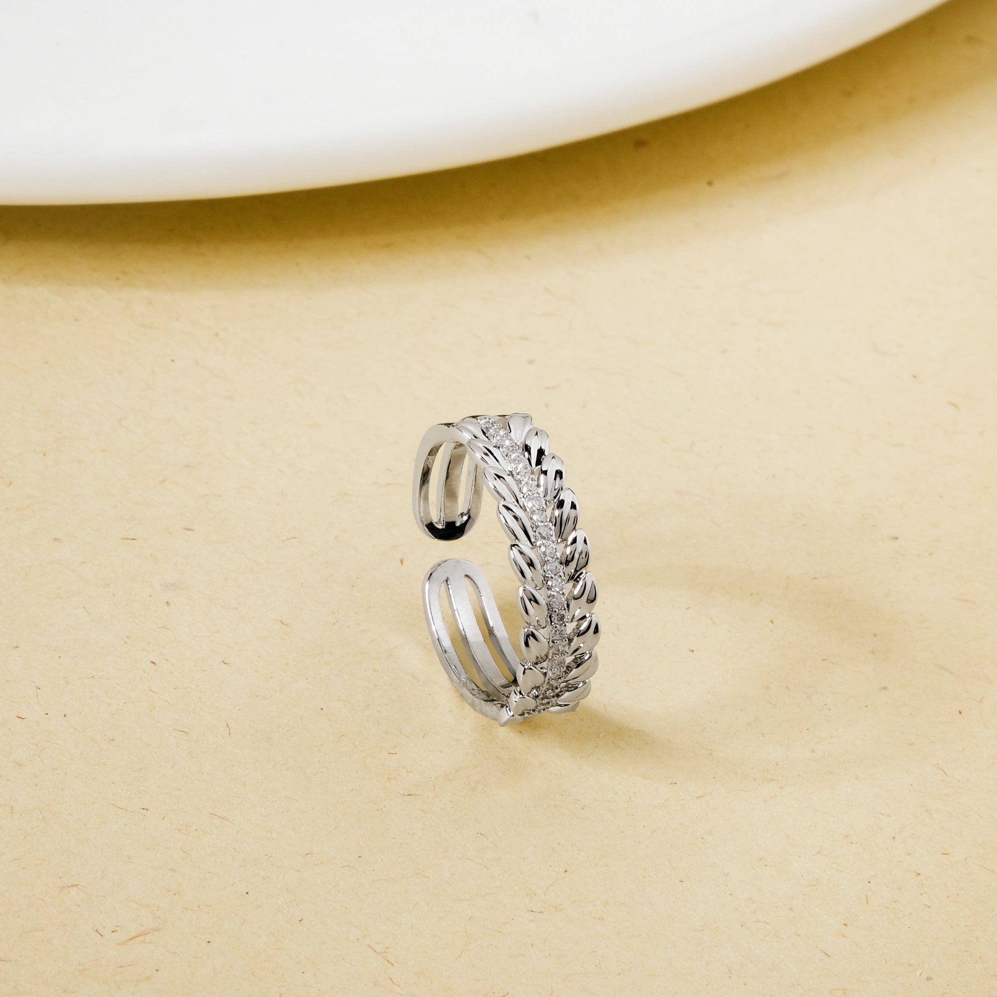 Inspired by nature's quiet elegance, this beautiful silver ring is where delicate craftsmanship meets celestial beauty. The band is intricately designed to resemble a wreath of silver leaves, gracefully wrapping around your finger like a timeless symbol of growth and renewal. Running through its center, a row of luminous stones shimmers with an iridescent glow, reflecting light with every movement. Effortlessly ethereal yet undeniably striking, this ring is a wearable piece of enchantment.