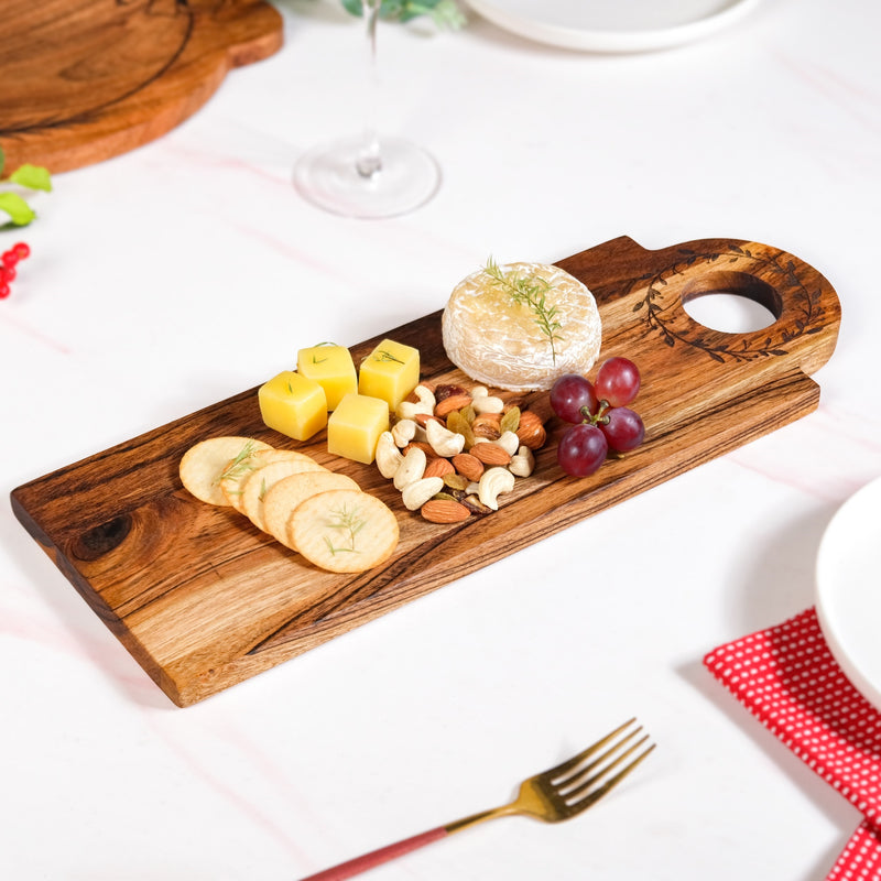 Benefits: Practical and versatile, this wooden platter serves as a food platter, cheese board, or decorative serving tray. The elongated form accommodates multiple items, while the sturdy handle ensures easy carrying. Durable acacia resists everyday wear, making it perfect for hosting, gifting, or daily meals.