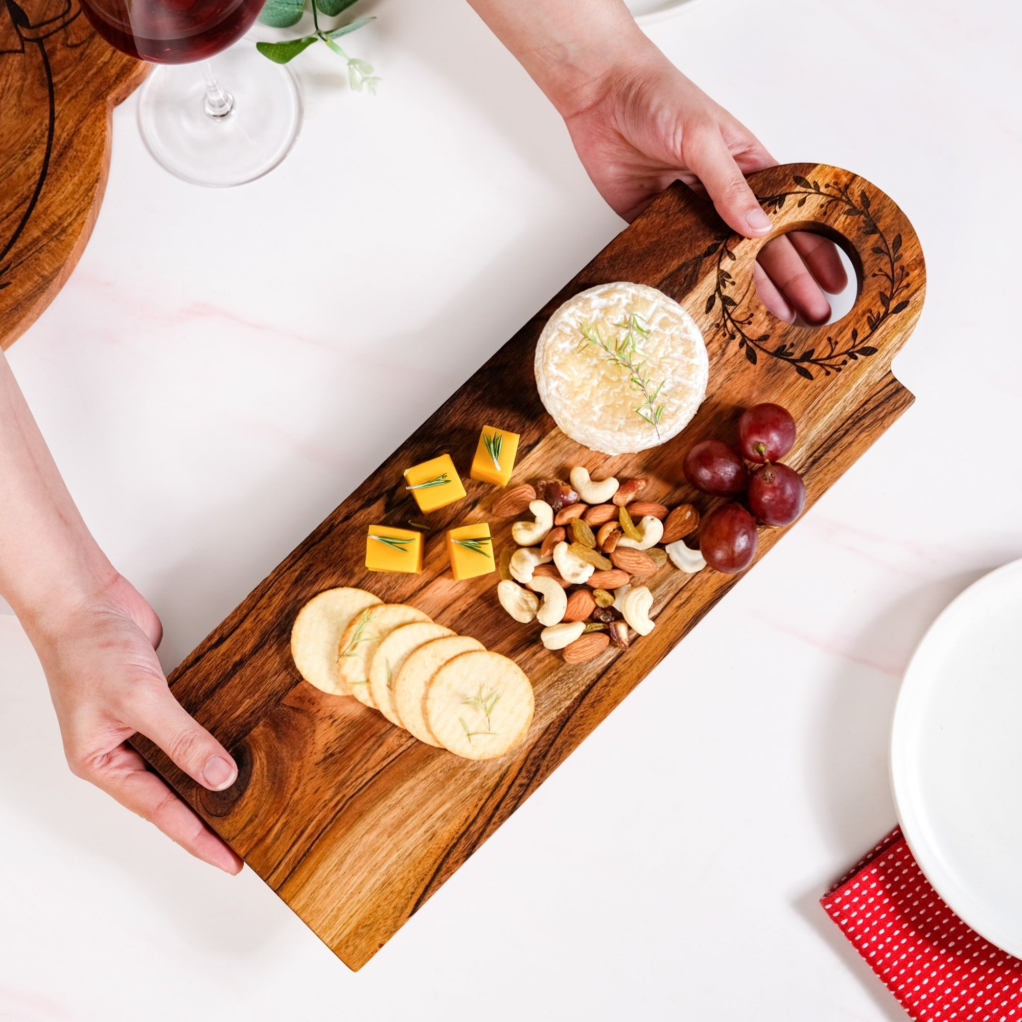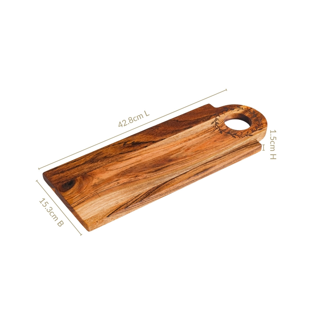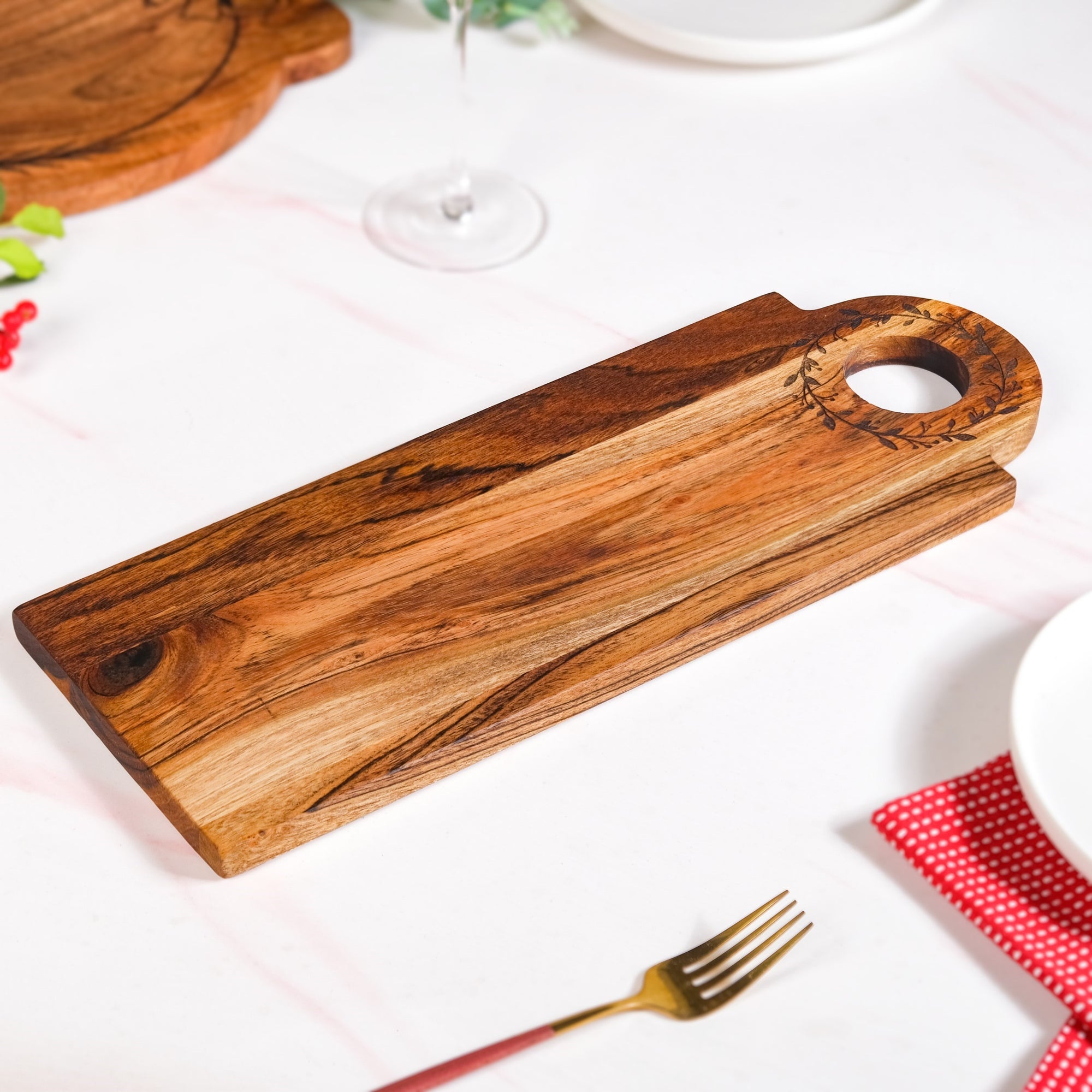 Design: The rectangular shape offers a sleek, versatile base for serving. A circular loop at the head of the board allows convenient hanging and storage. The engraved leaf motif near the handle lends a handcrafted artisanal finish, enhancing its decorative appeal. Made from 100% acacia wood, use a damp cloth to wipe and let it air dry for long-lasting use.