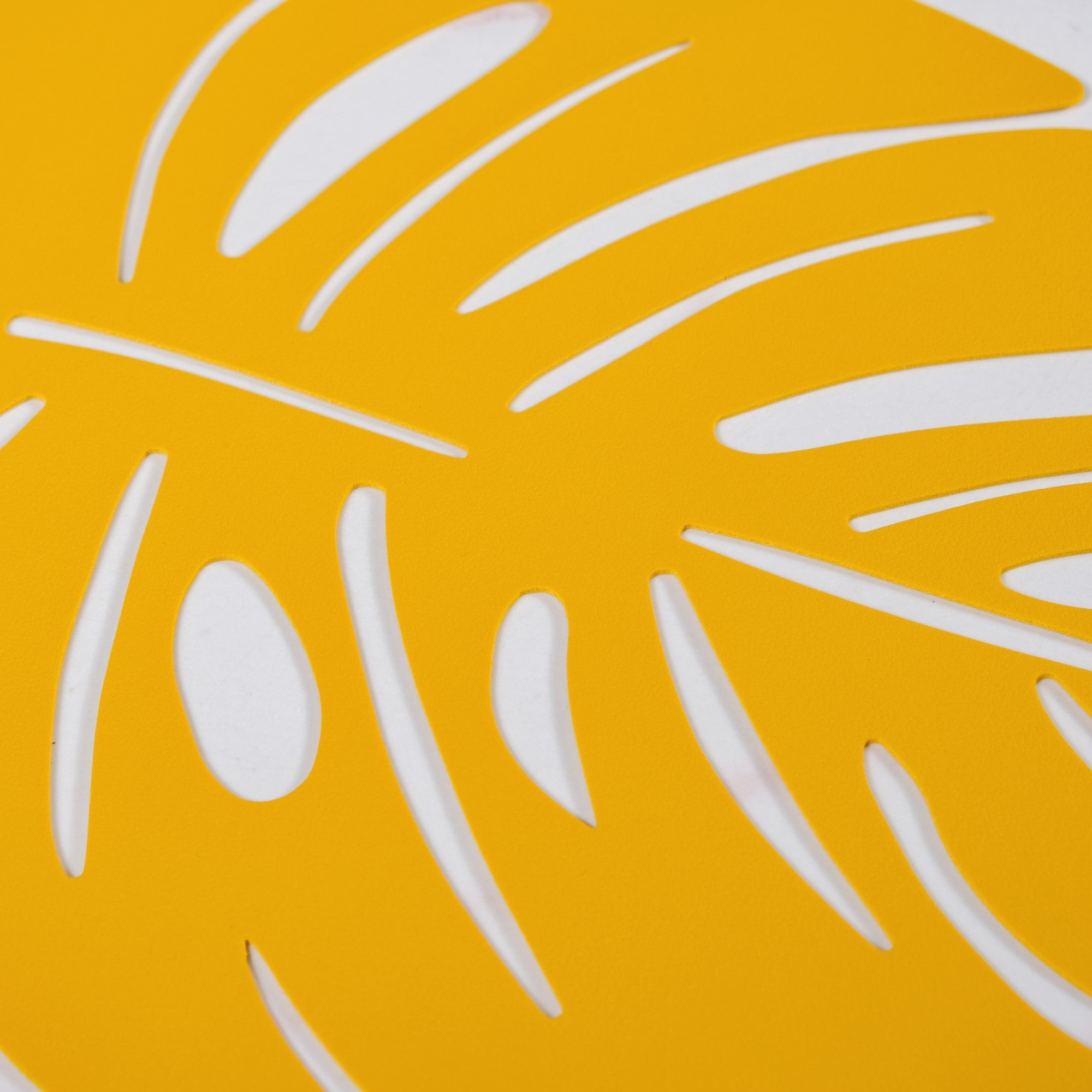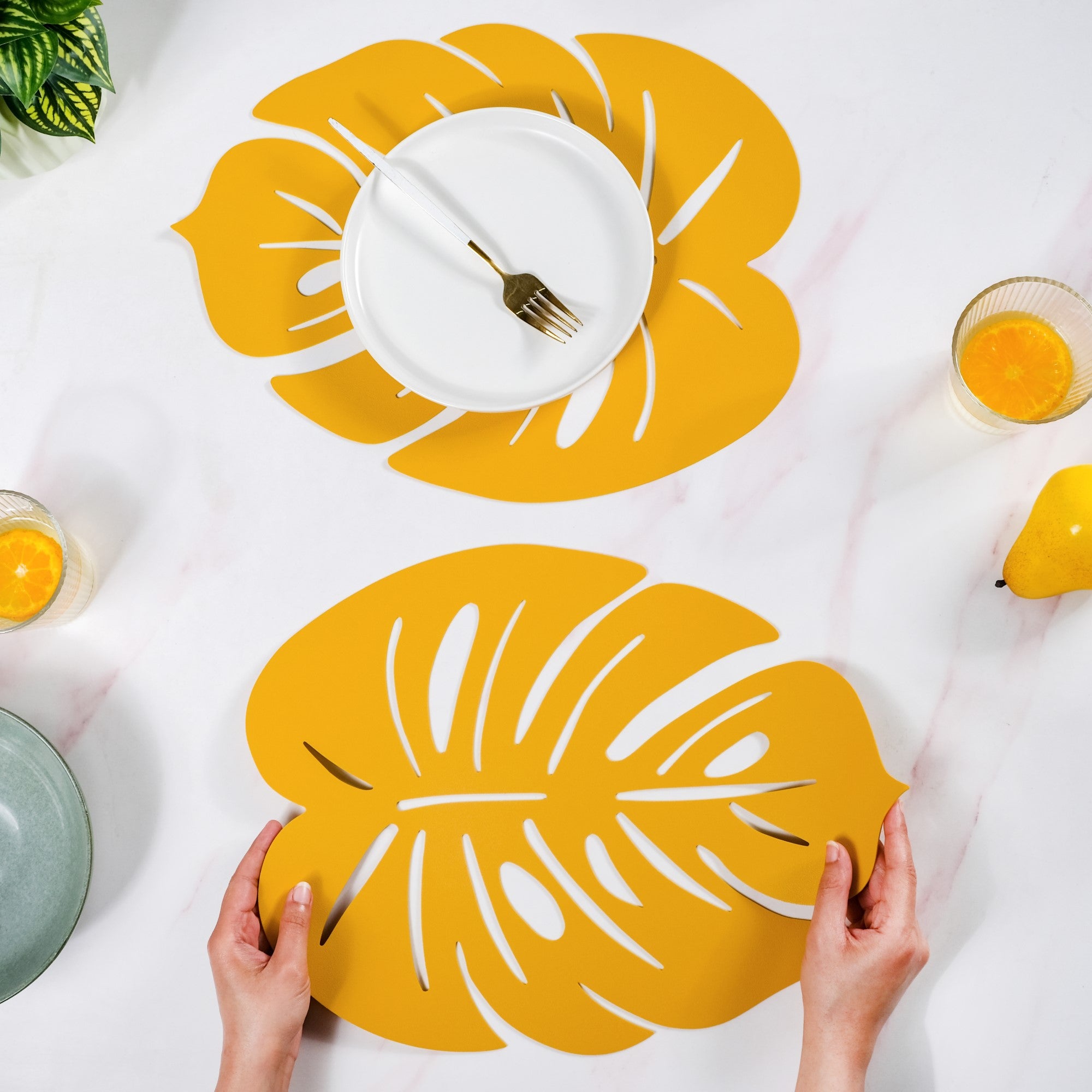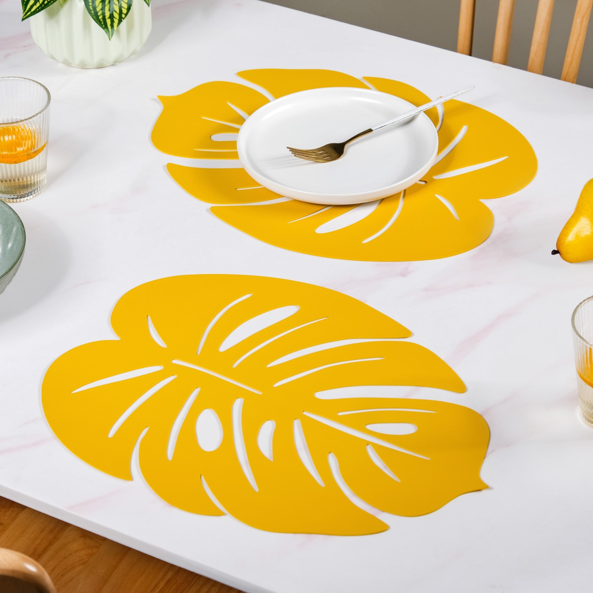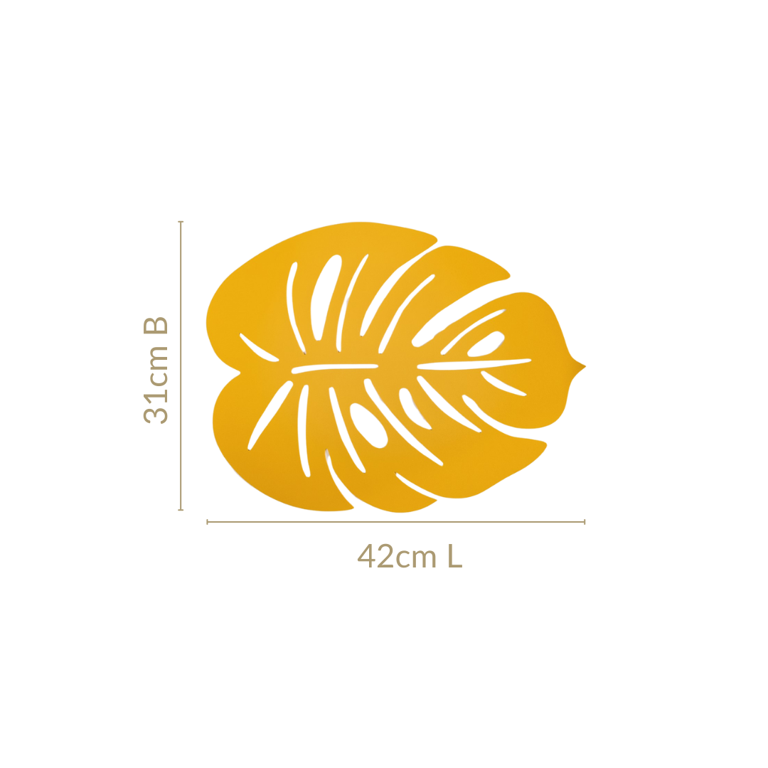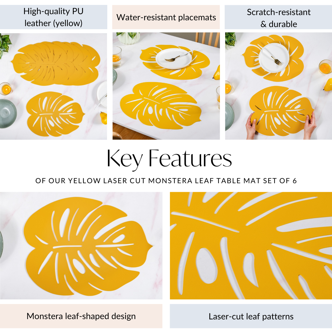 Design: Inspired by the lush beauty of monstera leaves, the placemats feature a unique shape with intricate laser-cut leaf patterns. The bold yellow hue adds a cheerful, contemporary flair, making them a striking addition to any tablescape.