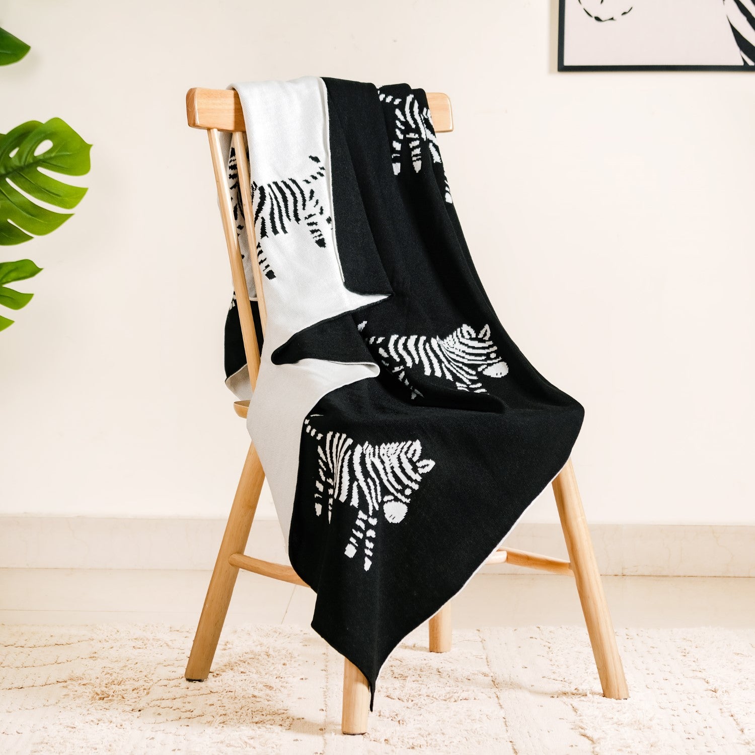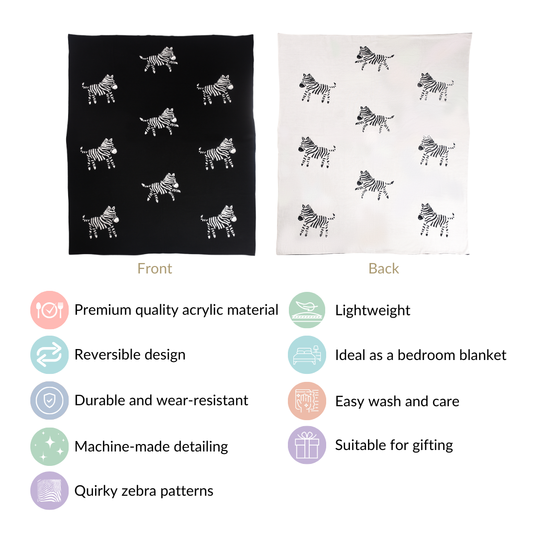 Our reversible throw blanket in a quirky zebra pattern is the perfect choice for a cosy and snug evening at home. The throw is meticulously crafted with premium-quality acrylic material and boasts of durability. This versatile throw for couch is wear-resistant, making it hassle-free to clean. The machine-made detailing of the sofa throw renders a fine finish to the product and impeccable quality. The sofa blanket is lightweight and easy to wash and take care of. Be it a housewarming party or a festive ambience, this throw makes for an ideal gifting option.